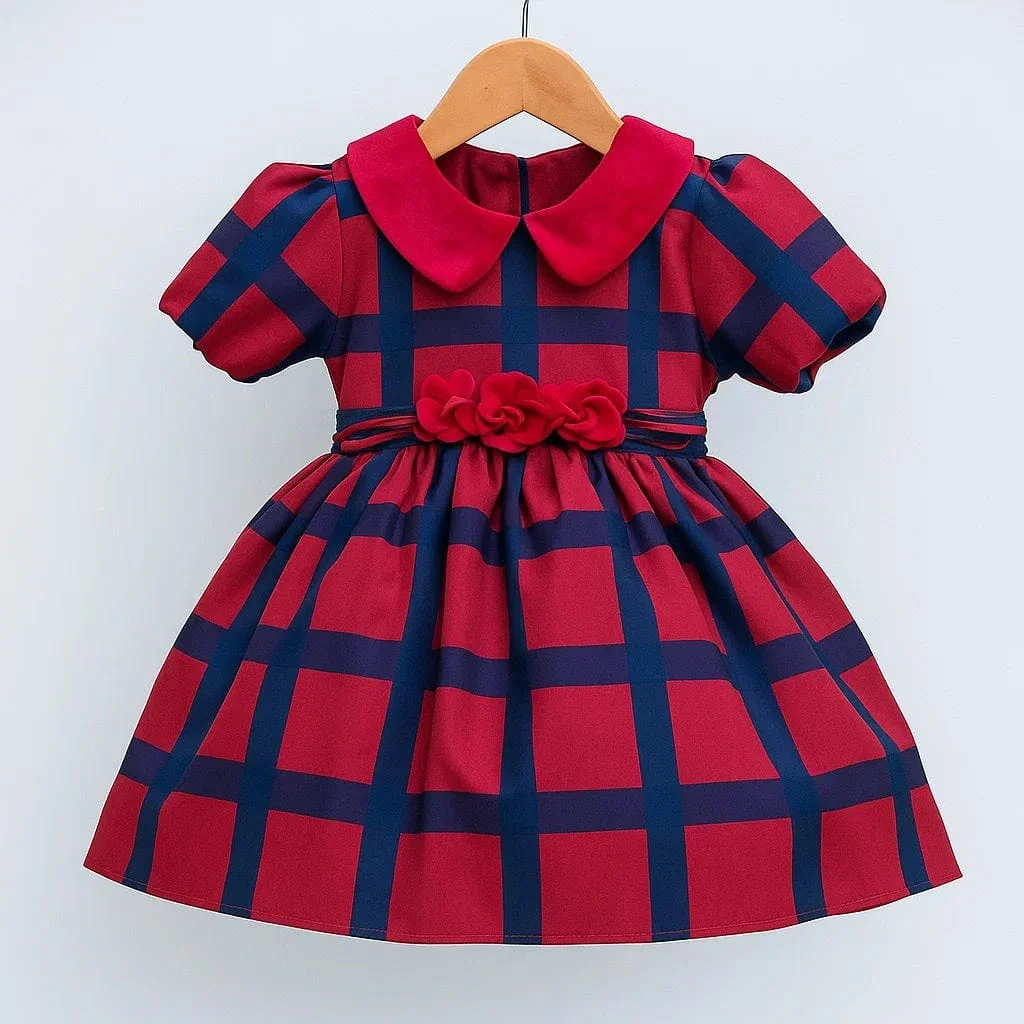 Abito a palloncino, fantasia a quadri in tessuto simil taffetà, con manica a sbuffo, colletto e fiori in vita in velluto.