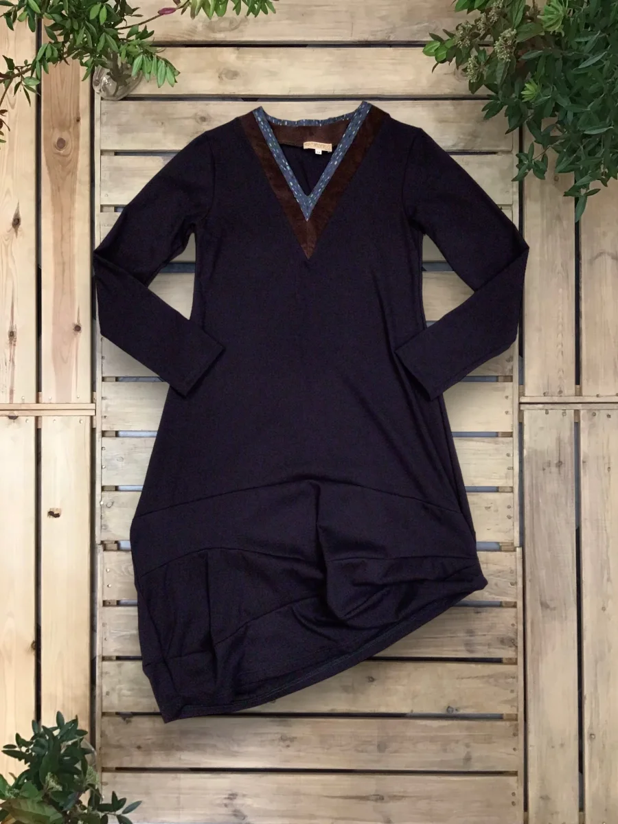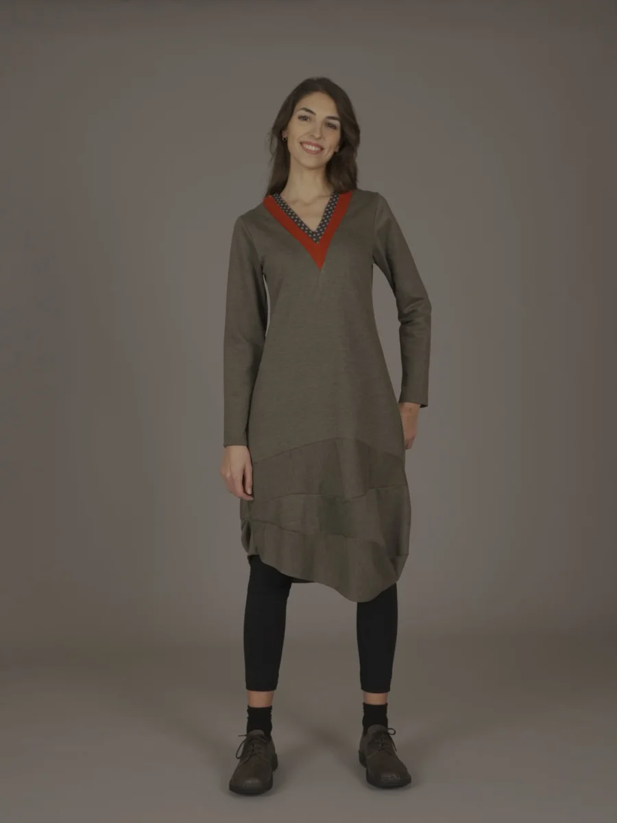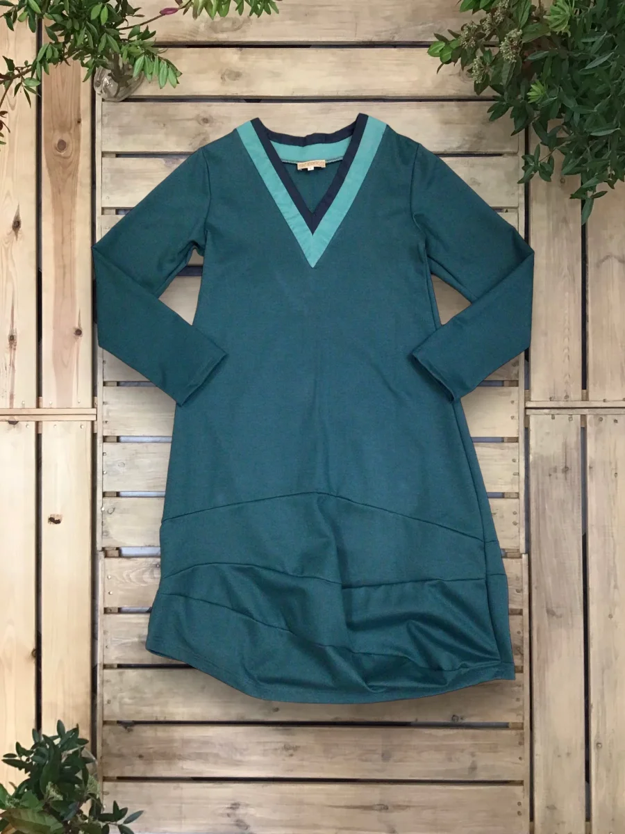 Abito in punto milano con doppio bordo in tessuto a contrasto sullo scollo.