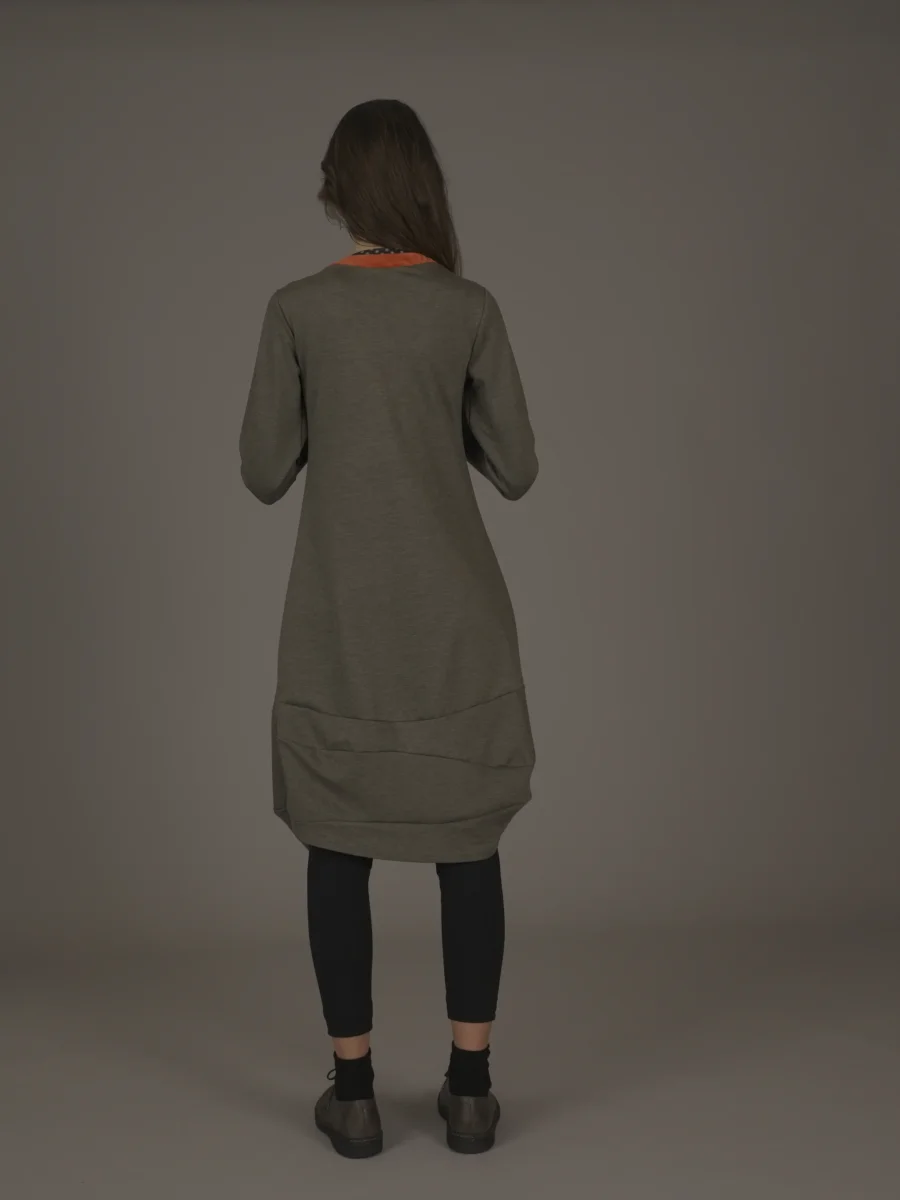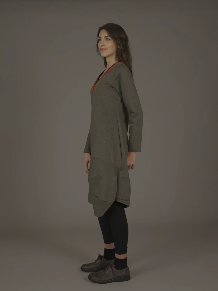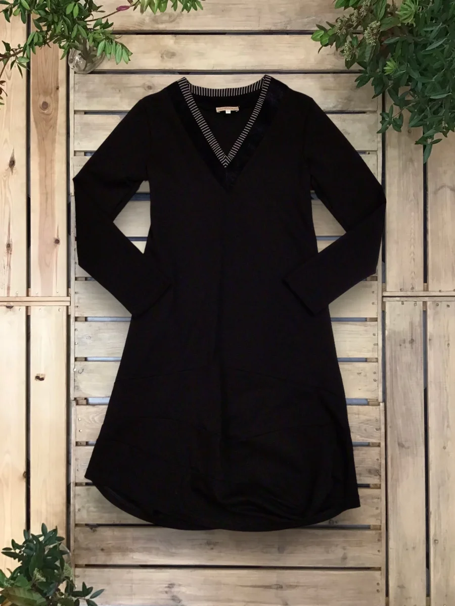Abito in punto milano con doppio bordo in tessuto a contrasto sullo scollo.