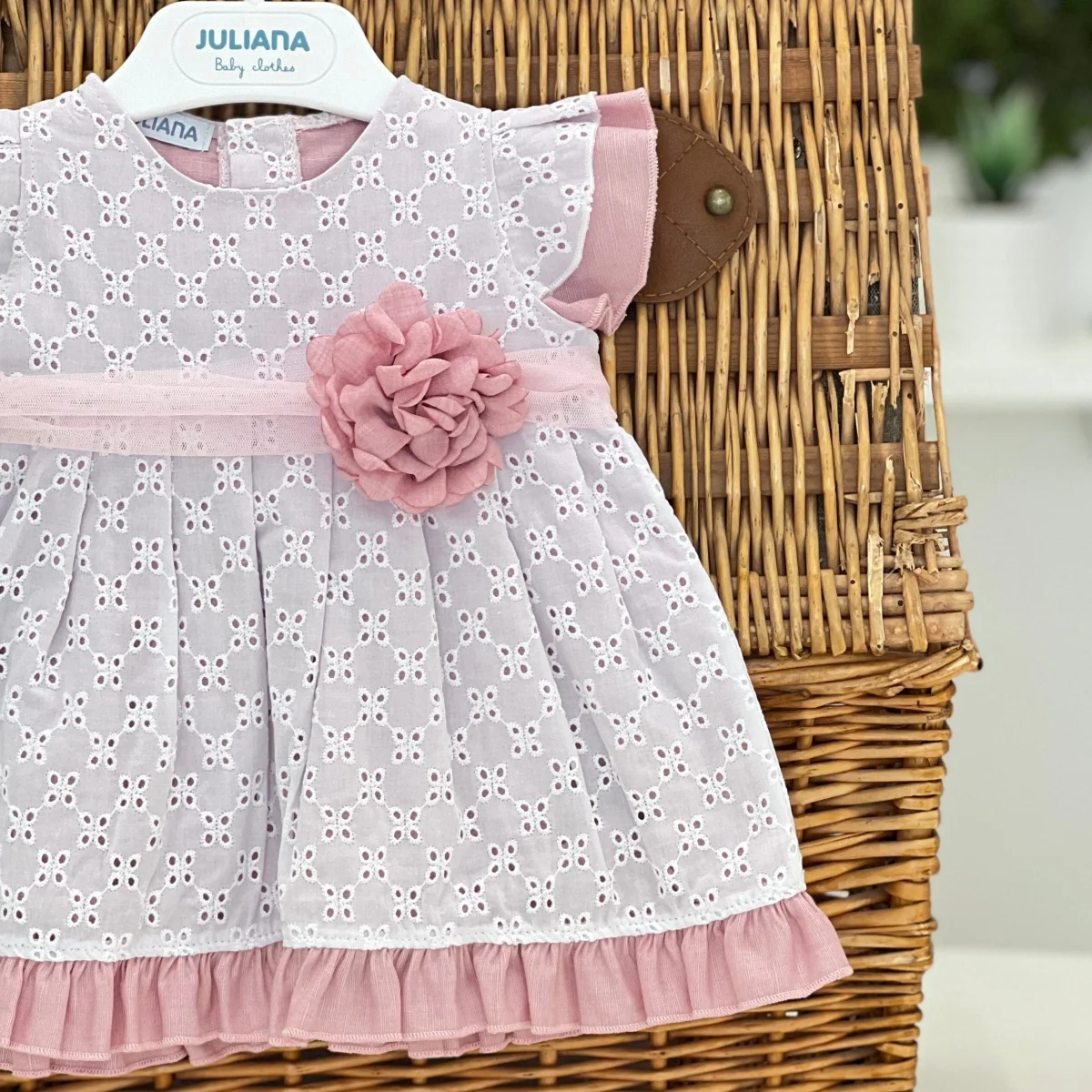 Abito in sangallo e lino, cintura in tulle con fiocco e dettaglio floreale.
