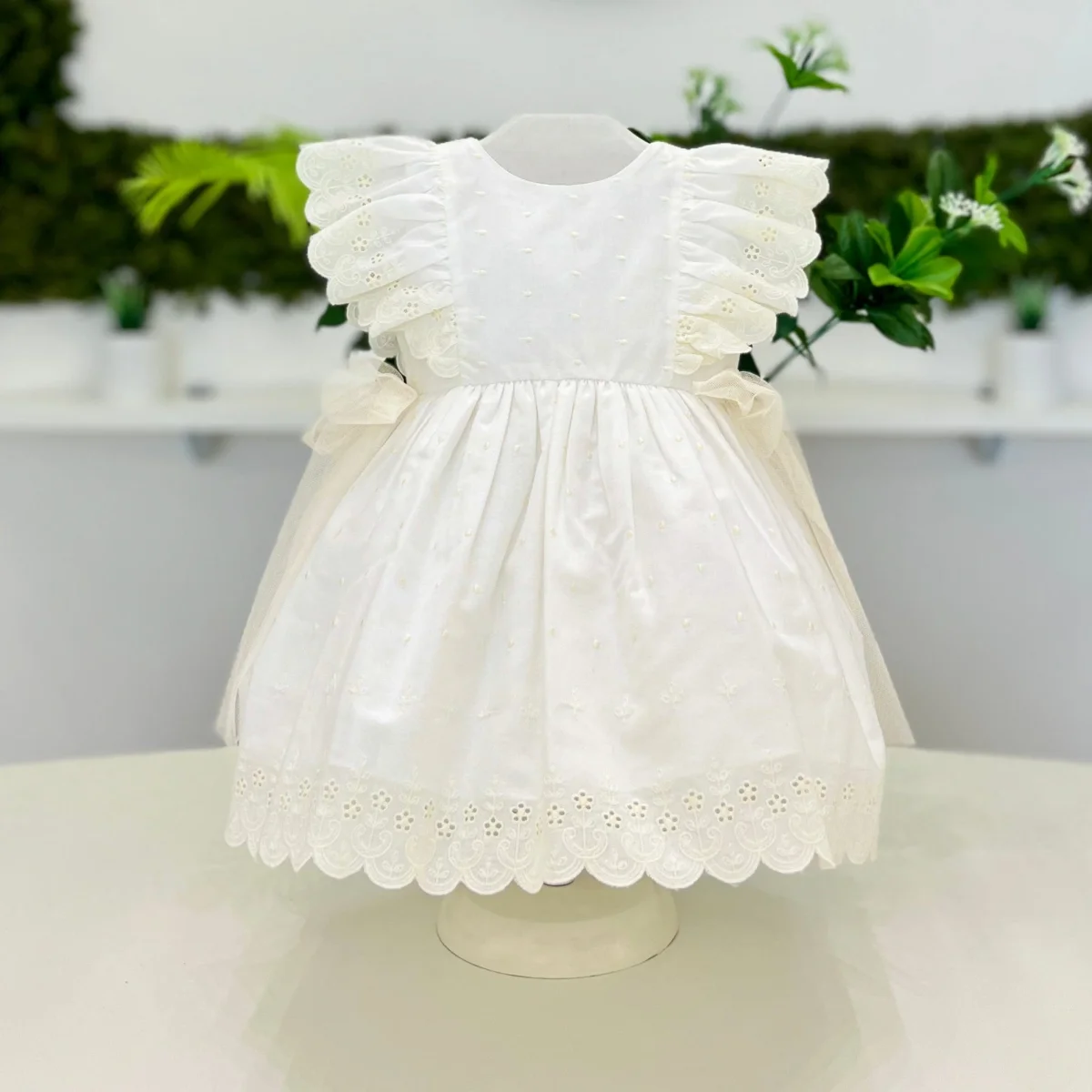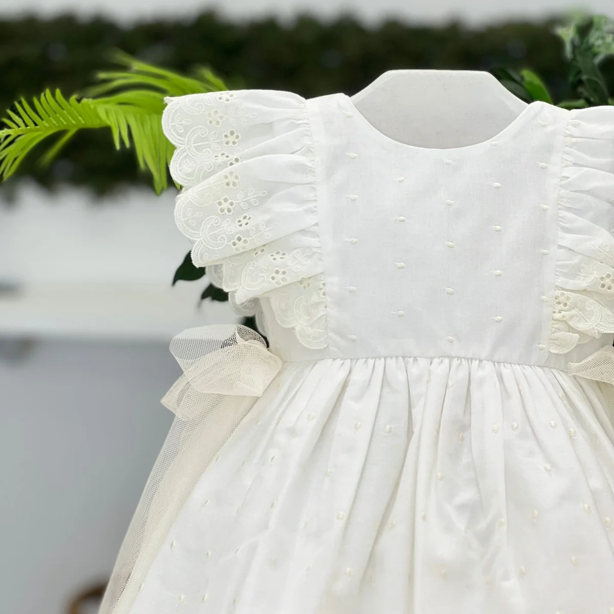 Abito per bimba in cotone plumetis, bordato in pizzo, con maniche impreziosite da rouches in pizzo e fiocchi in vita in tulle. Un look delicato e raffinato, ideale per ogni occasione speciale.