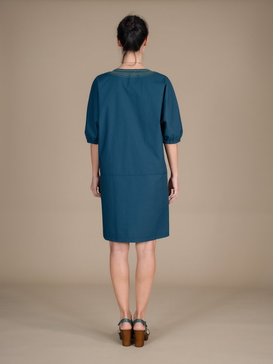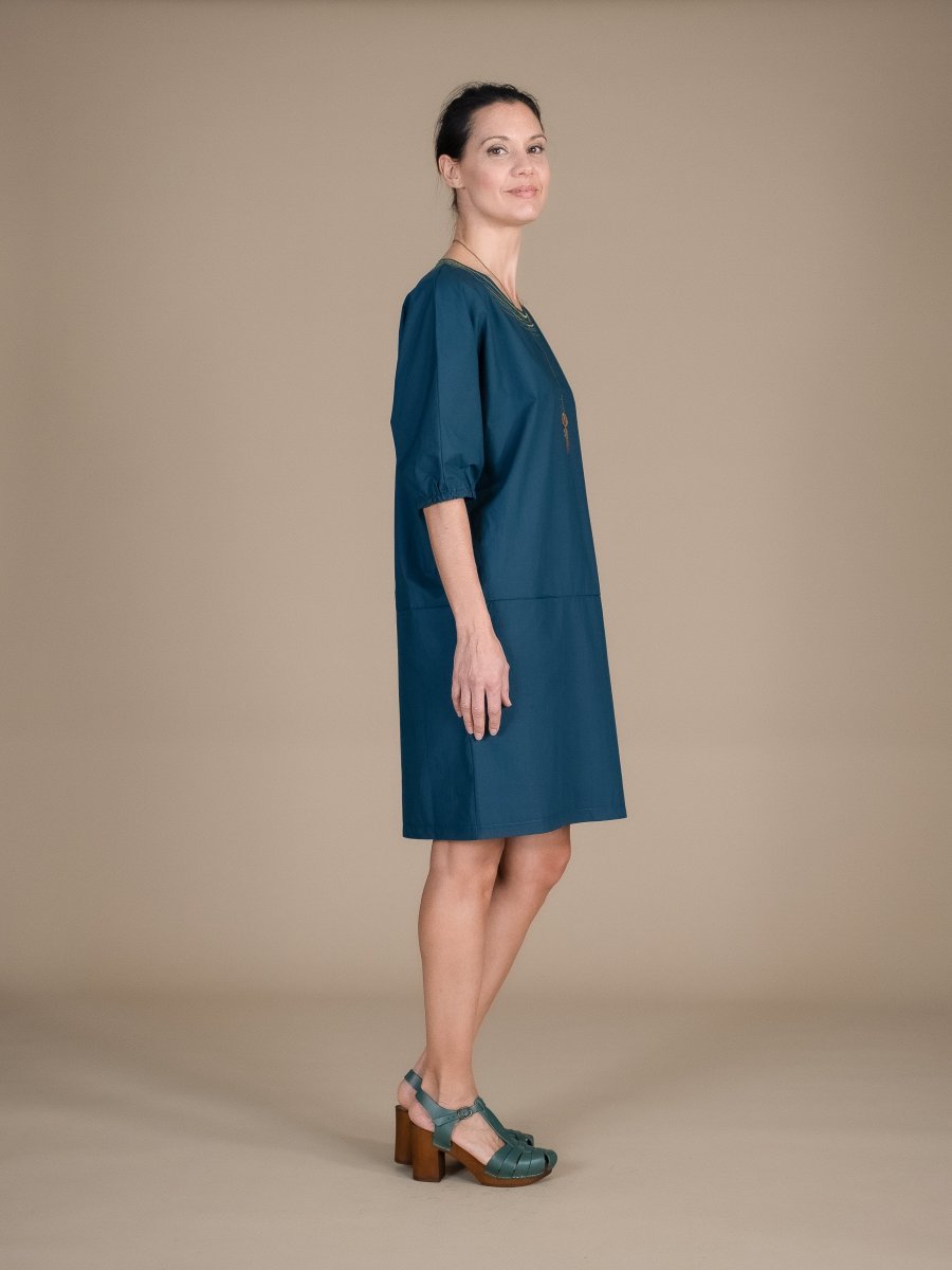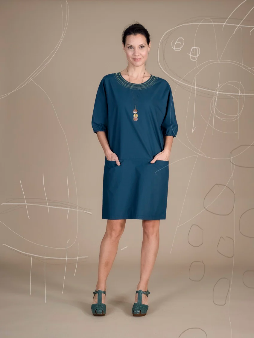 Abito a scatoletta con tasche sul davanti e ricamo sullo scollo.