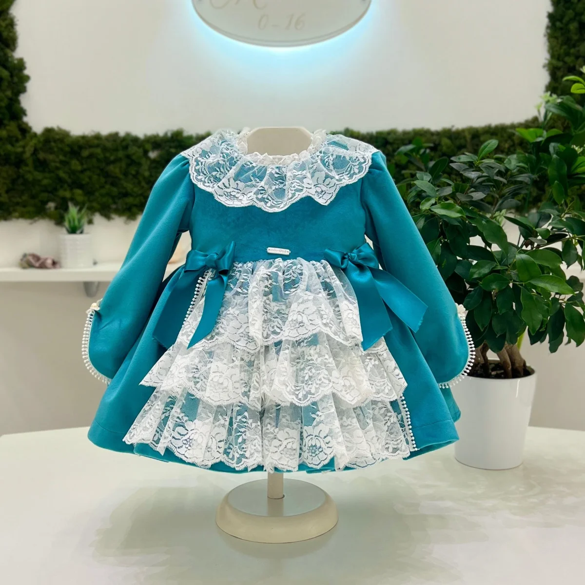 Abito in vellluto con balze frontali in pizzo, con manica rifinita pizzo, fiocchi in raso e girocollo in pizzo. Cintura in tulle plumetis.