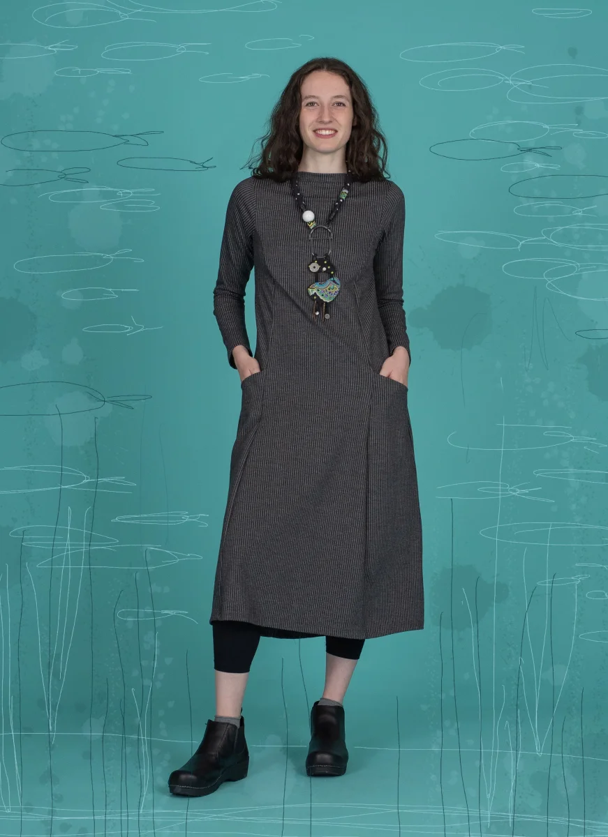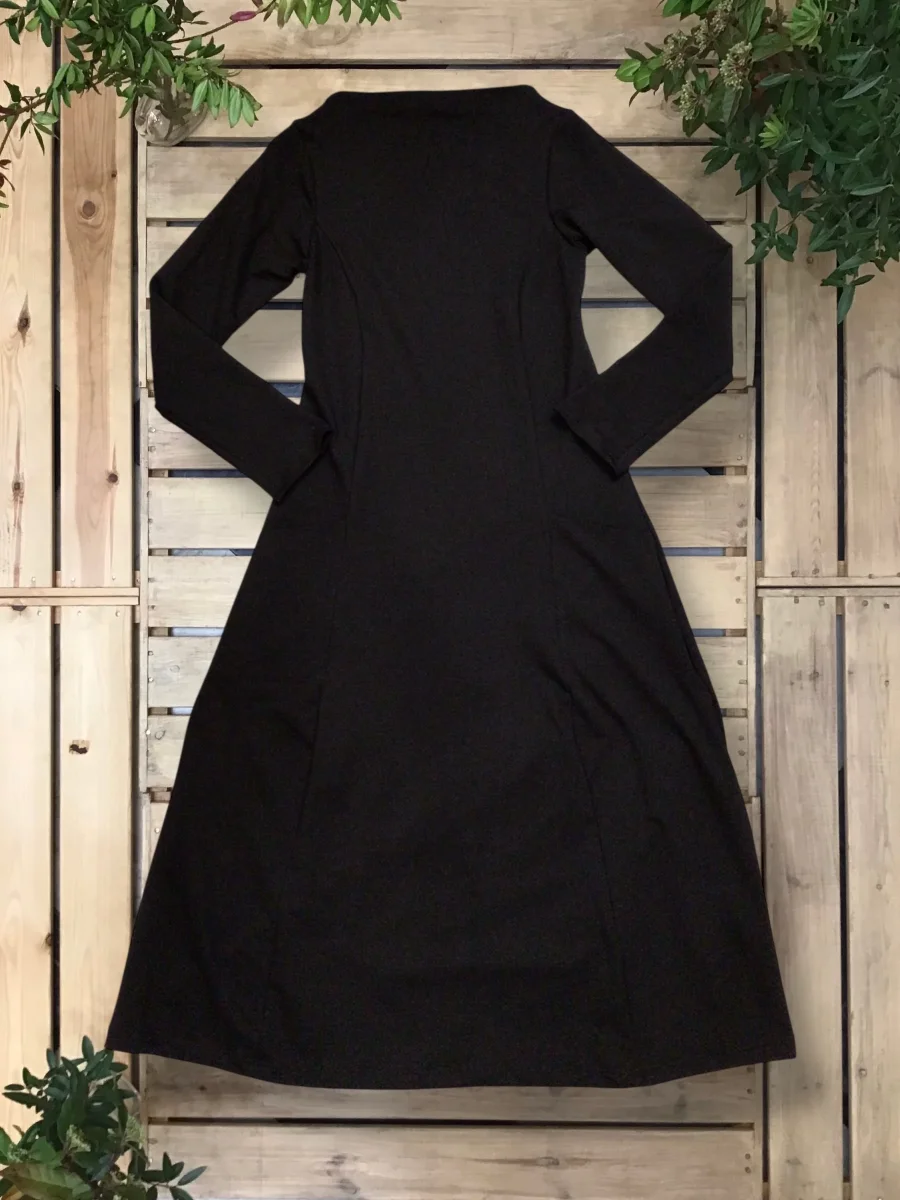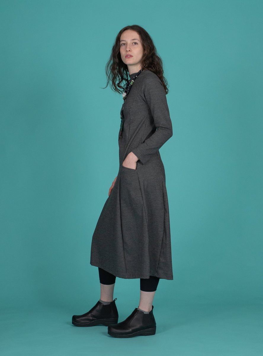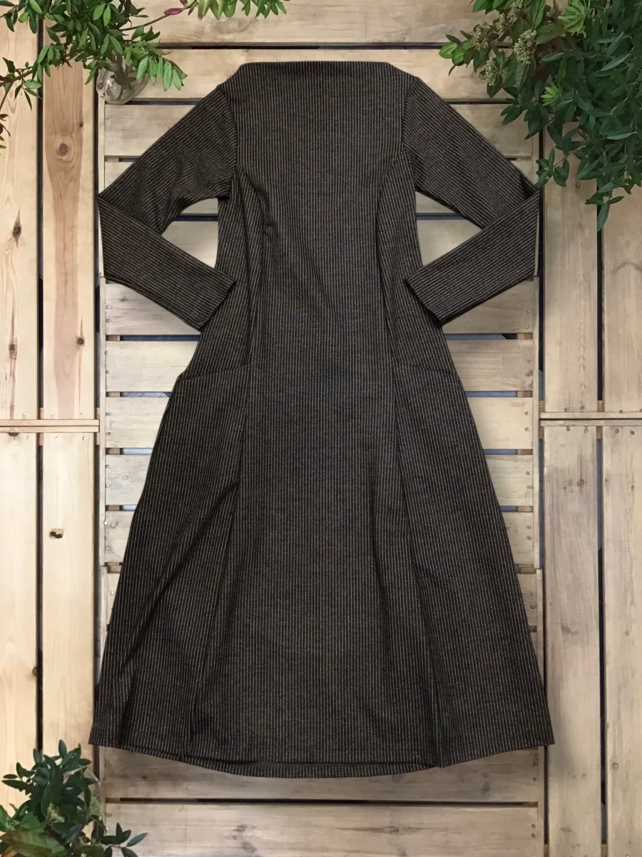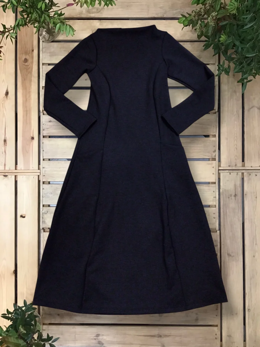 Abito volumetrico con tasche, scollo a barchetta.