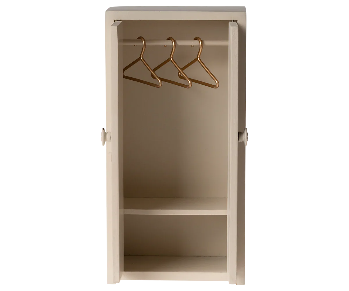 Un piccolo armadio in legno con tre piccole grucce dorate per tenere in ordine gli abiti della famiglia dei topi e appoggiare tutti i loro accessori sui ripiani. Questo piccolo armadio è proprio quello che serve nelle camere dei nostri amici topolini.