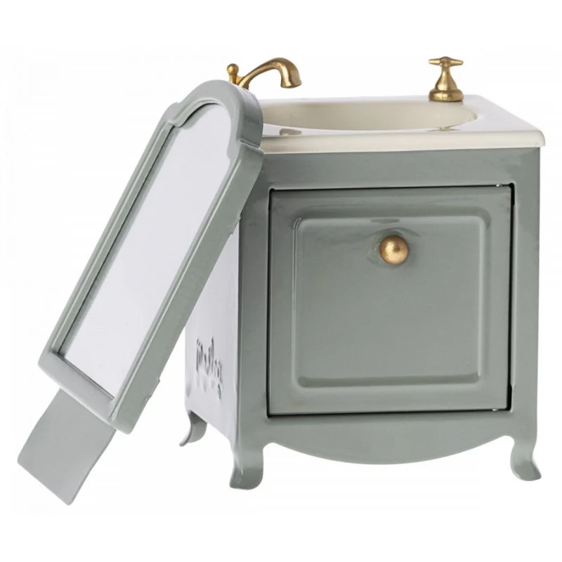 Il grazioso mobile lavabo dotato di rubinetteria e specchio, è anche un pratico mobile. Ha un piccolo armadio sotto il lavandino. Realizzato in metallo si adatta perfettamente alle case e al castello Maileg