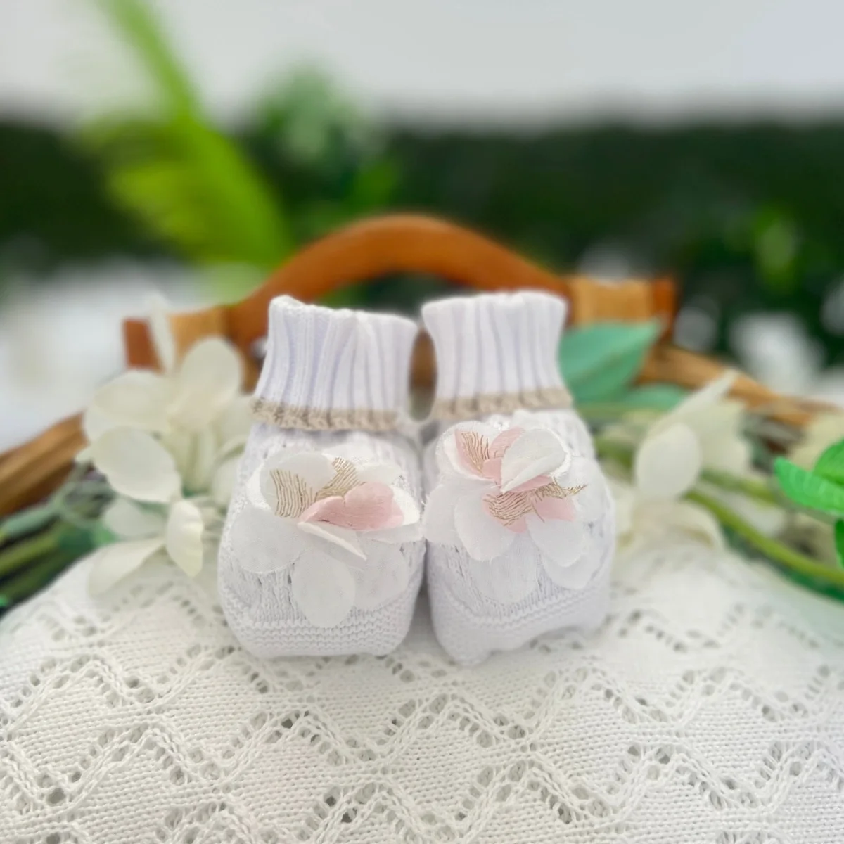 Babbucce in filo di cotone, soffici e traspiranti, ideali per coccolare i piedini del neonato con dolcezza.