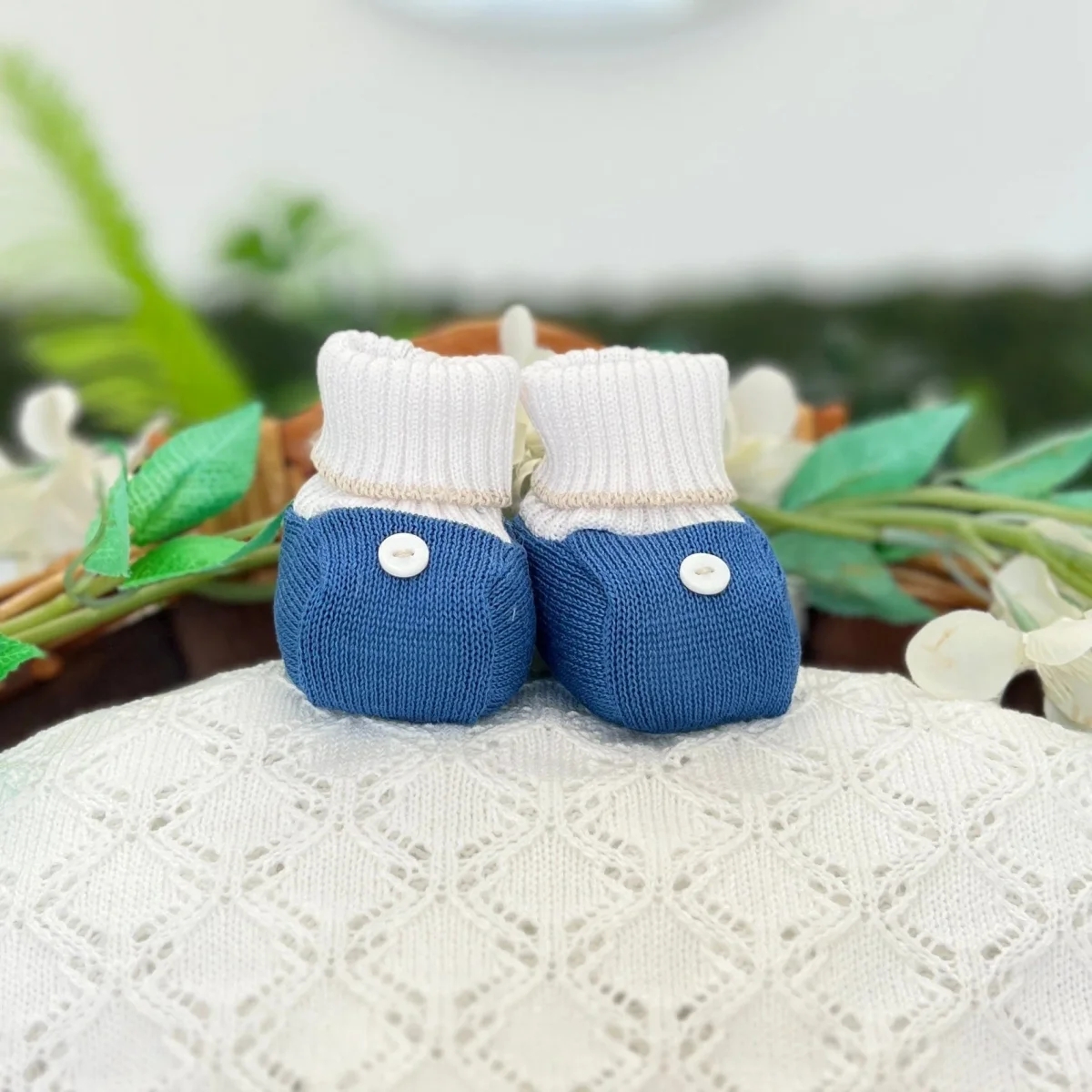 Babbucce in filo di cotone per neonato, con un delicato bottoncino. Un accessorio morbido e comodo, perfetto per completare il look del tuo piccolo con eleganza e praticità.