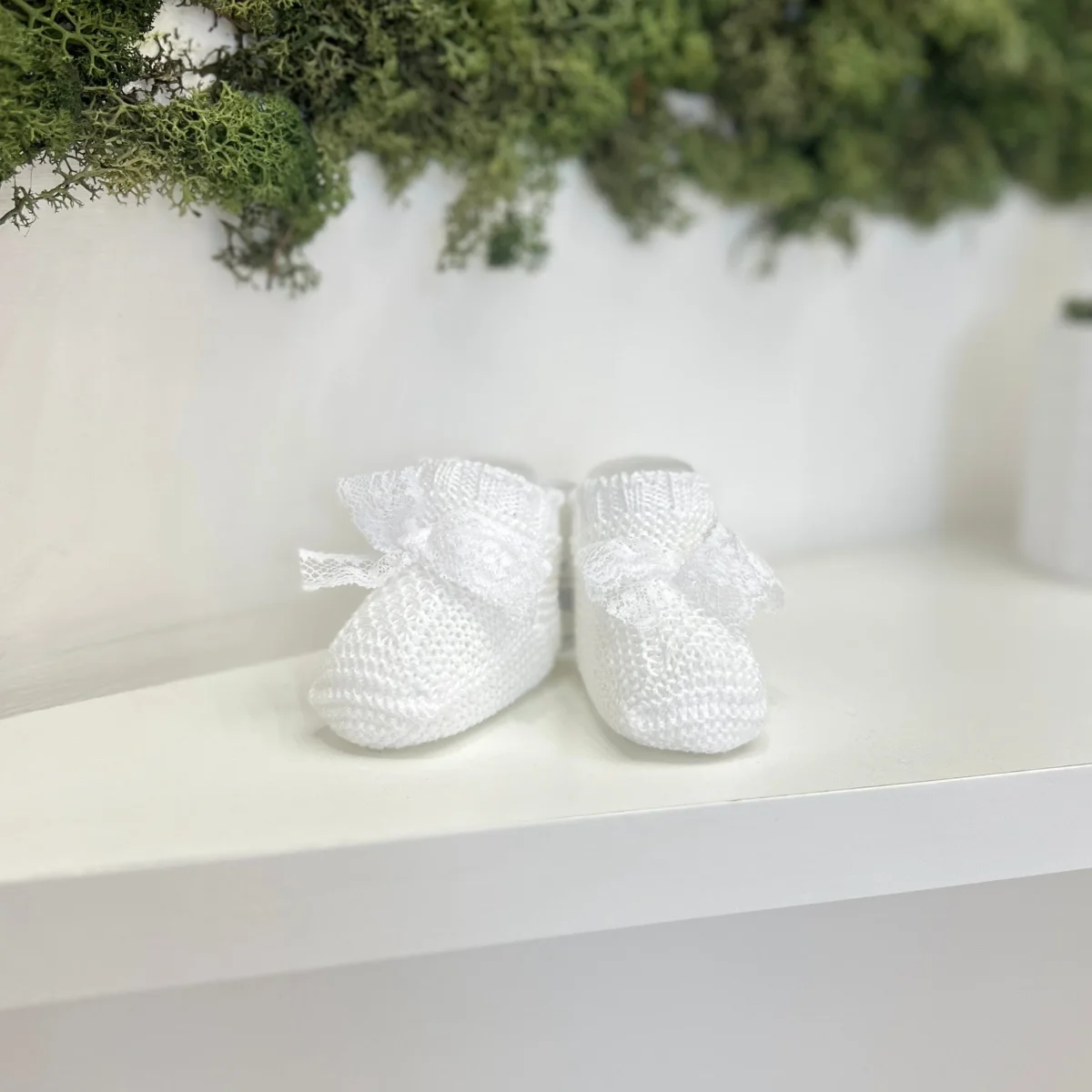 Scarpina in filo di cotone con fiocco in pizzo.