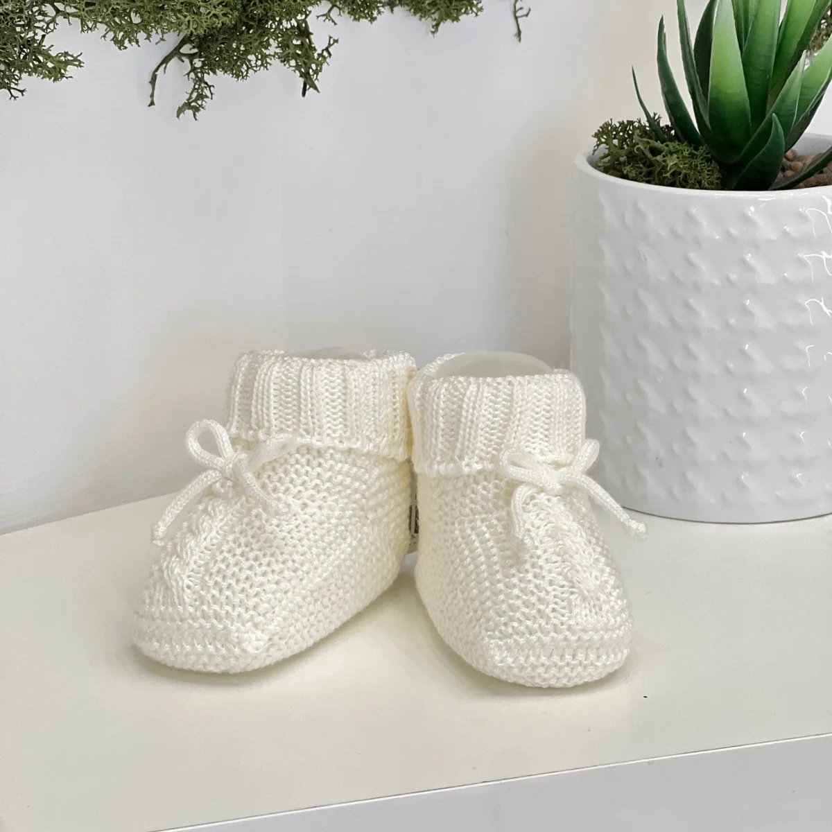 Scarpina neonato in filo di cotone con intrecci e cordoncino.