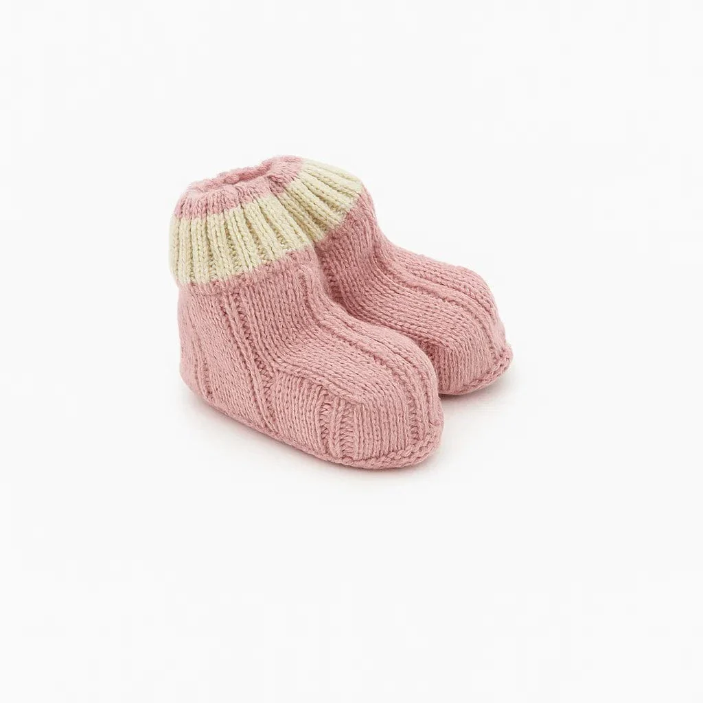 Babbucce in lana per neonata, morbide e avvolgenti, ideali per tenere i piedini al caldo con delicatezza.