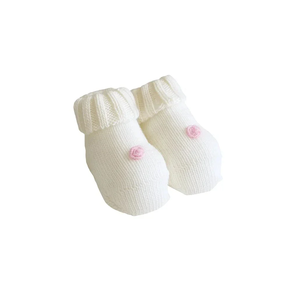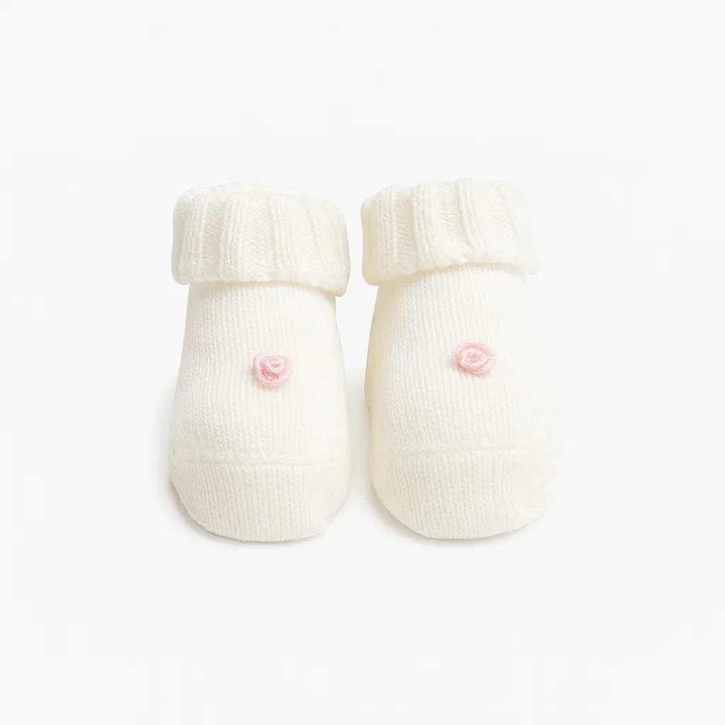Babbucce in maglia per neonata con punto smock e roselline ricamate a mano. Morbide e perfette da abbinare al completo.
