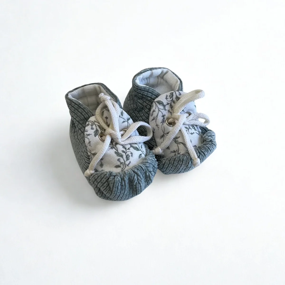 Babbucce in velluto millerighe per neonata, con inserti floreali applicati e cordoncino regolabile in tinta.