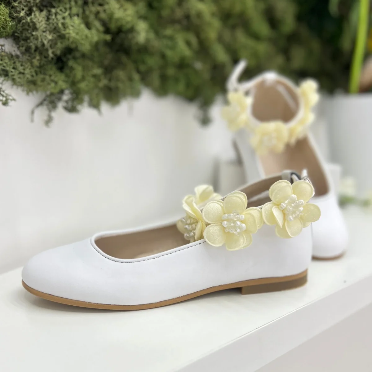 Ballerina bimba bianca in pelle, cinturino alla caviglia con dettagli floreali, raffinata e confortevole, perfetta per look eleganti.