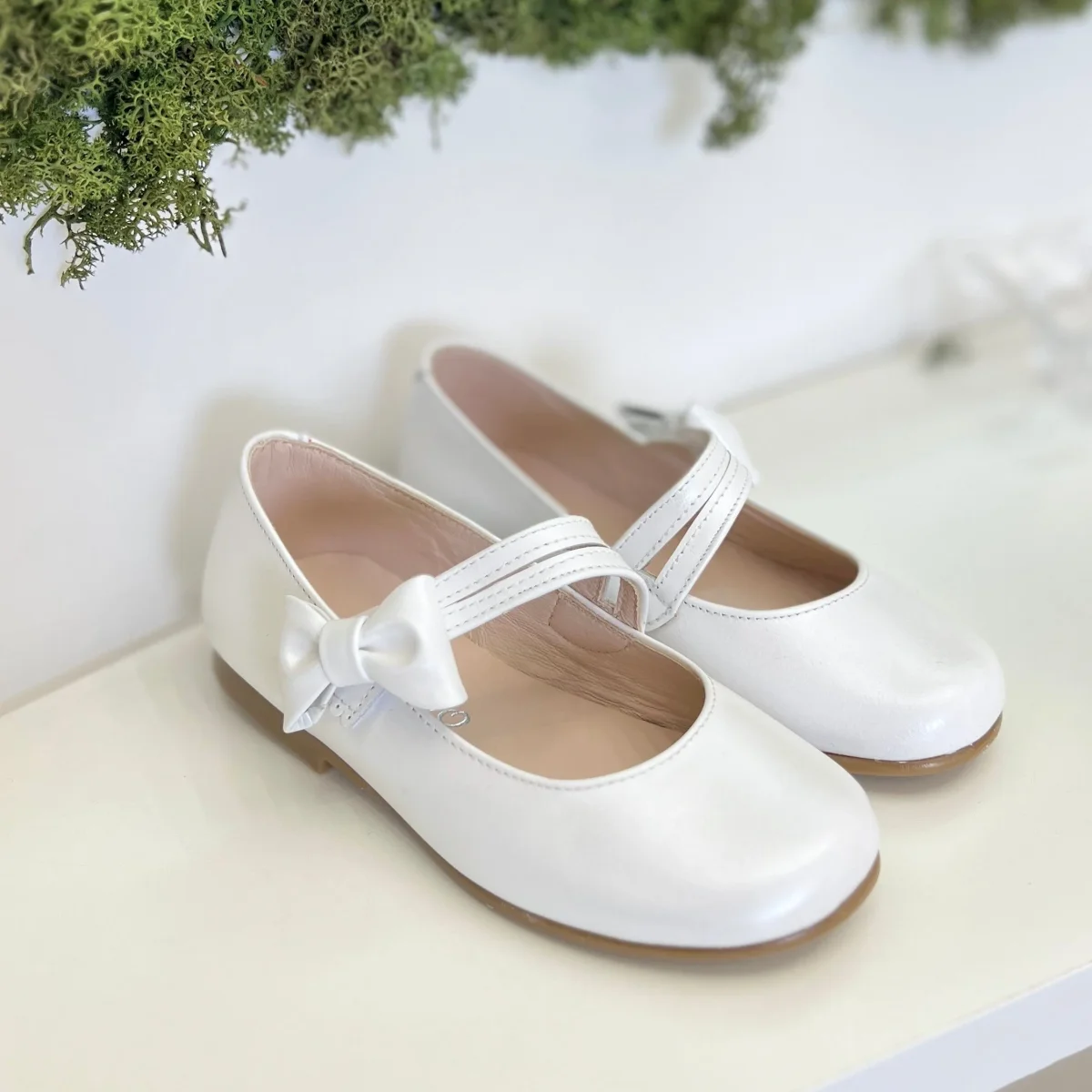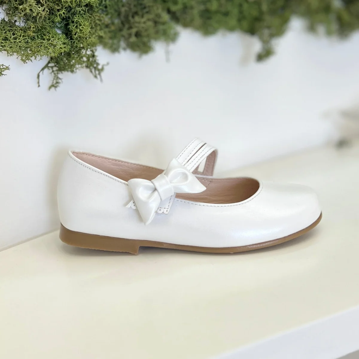 Ballerina in pelle bianco perlato, cinturino regolabile con fiocco, plantare anatomico e suola antiscivolo.