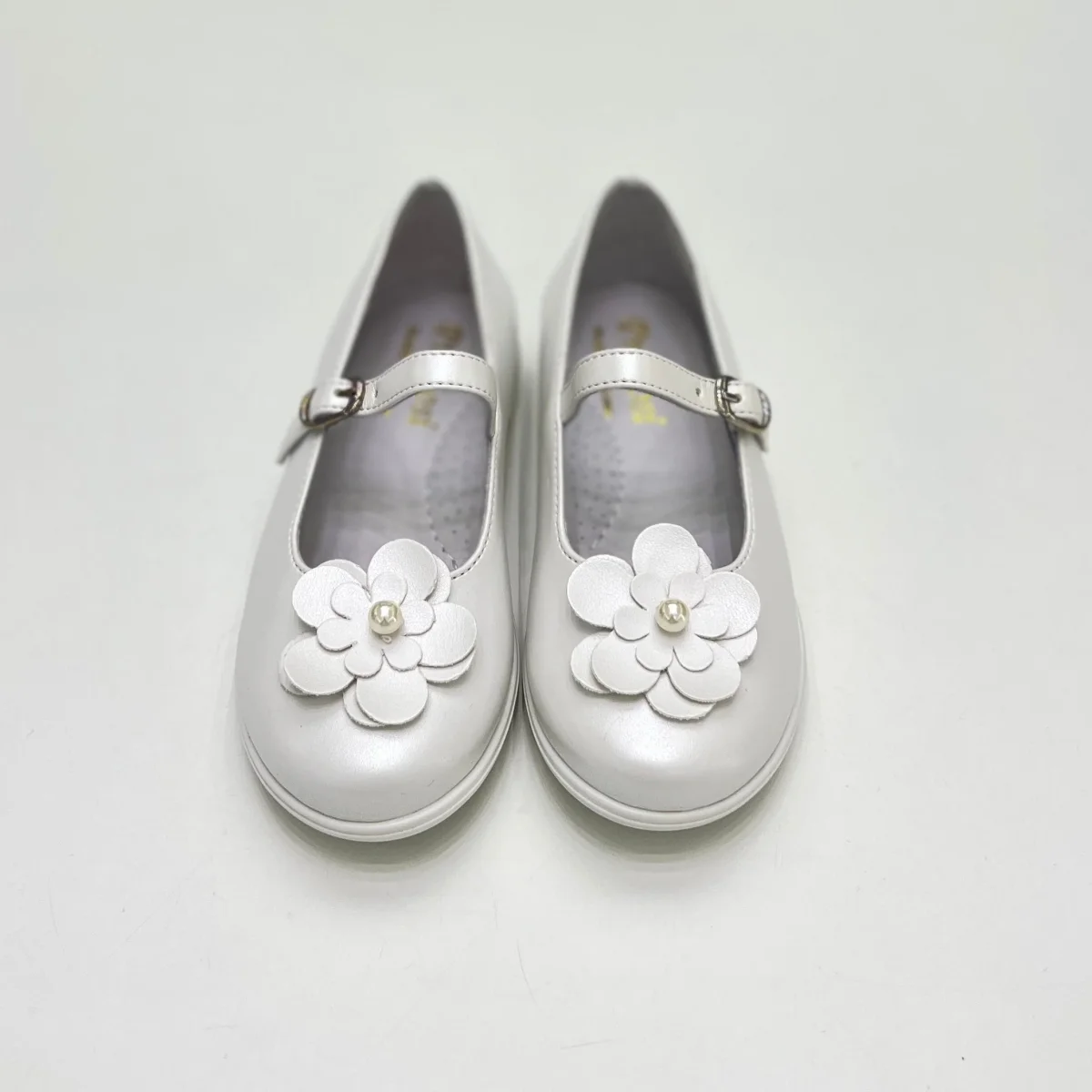 Ballerina bimba in pelle con fiore, cinturino con fibbia, plantare anatomico e suola antiscivolo, ideale per garantire comfort e stile in ogni passo.
