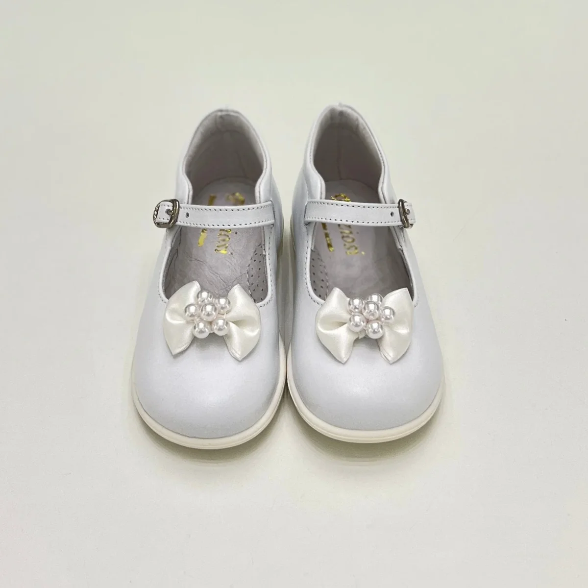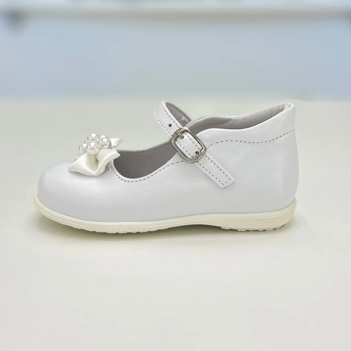 Ballerina primi passi bimba in pelle bianco , decorata con fiocchi e perline, cinturino con fibbia, plantare anatomico e suola antiscivolo.