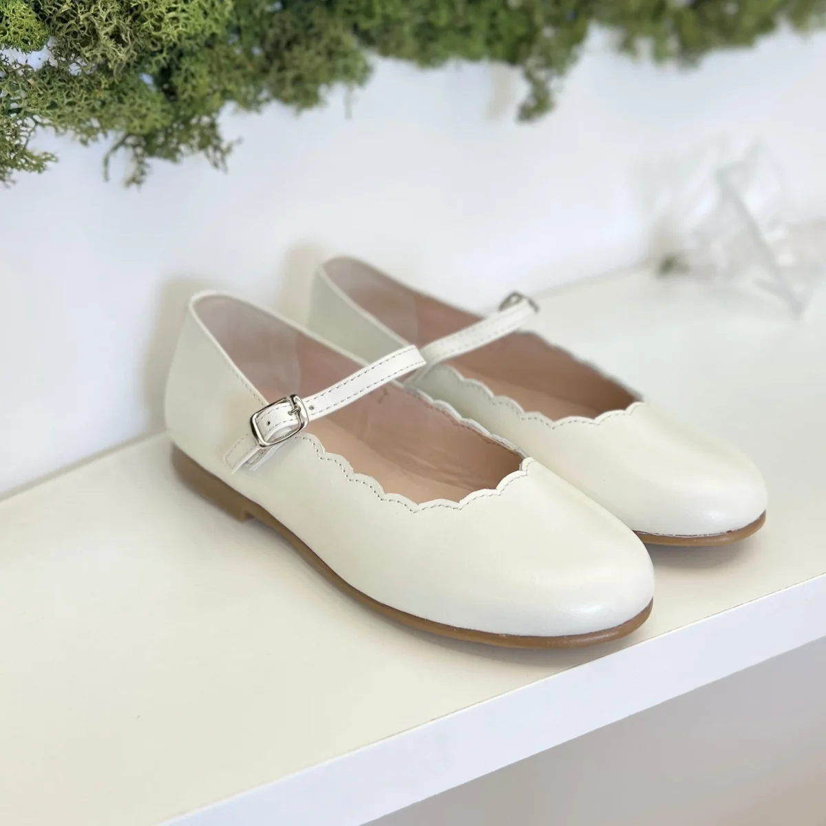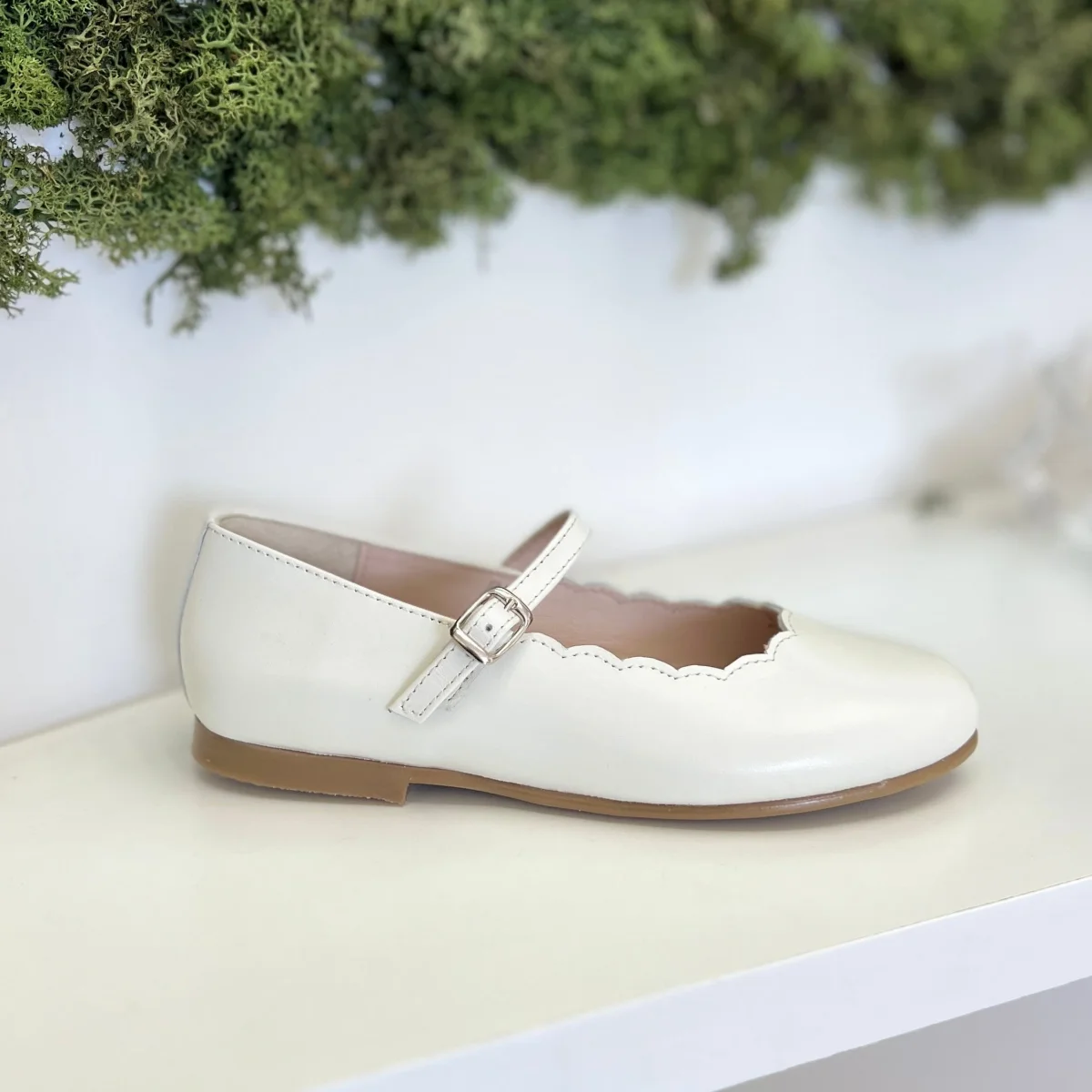 Ballerina elegante da cerimonia color panna in pelle, cinturino regolabile, plantare anatomico e suola antiscivolo.