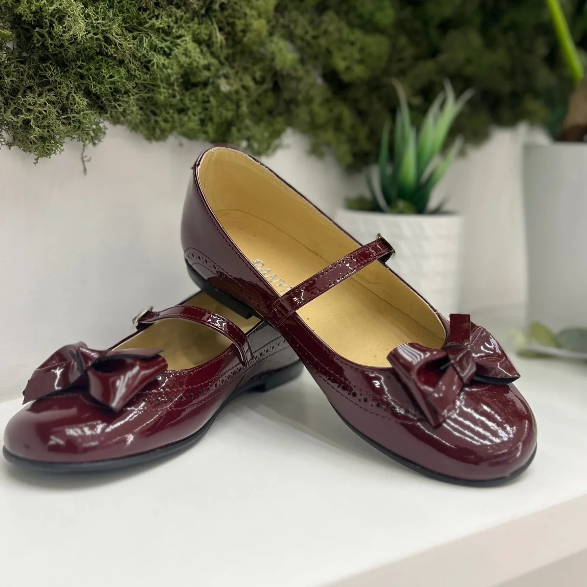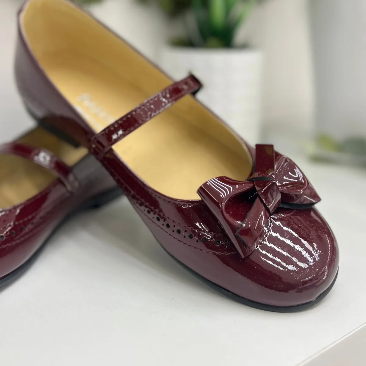 Ballerina lucida in vernice con fiocco e trafori.