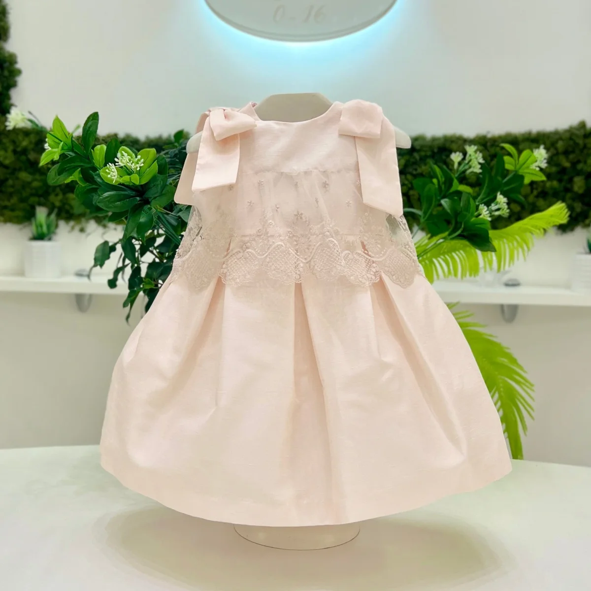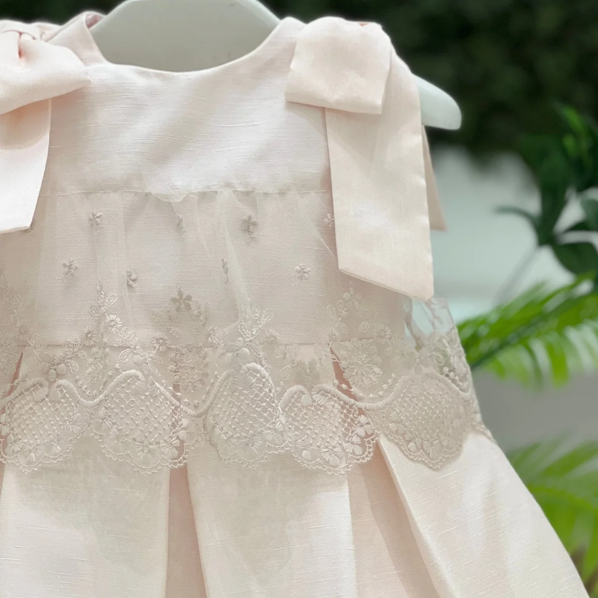 Abito da cerimonia rosa con un corpetto senza maniche, impreziosito da un delicato pizzo rosa e due fiocchi applicati sulle spalle per un tocco di eleganza. La gonna voluminosa con ampie pieghe crea un effetto romantico e raffinato. L’apertura posteriore con zip invisibile aggiunge praticità e perfezione al design. Un abito ideale per le occasioni speciali, che unisce grazia e stile.