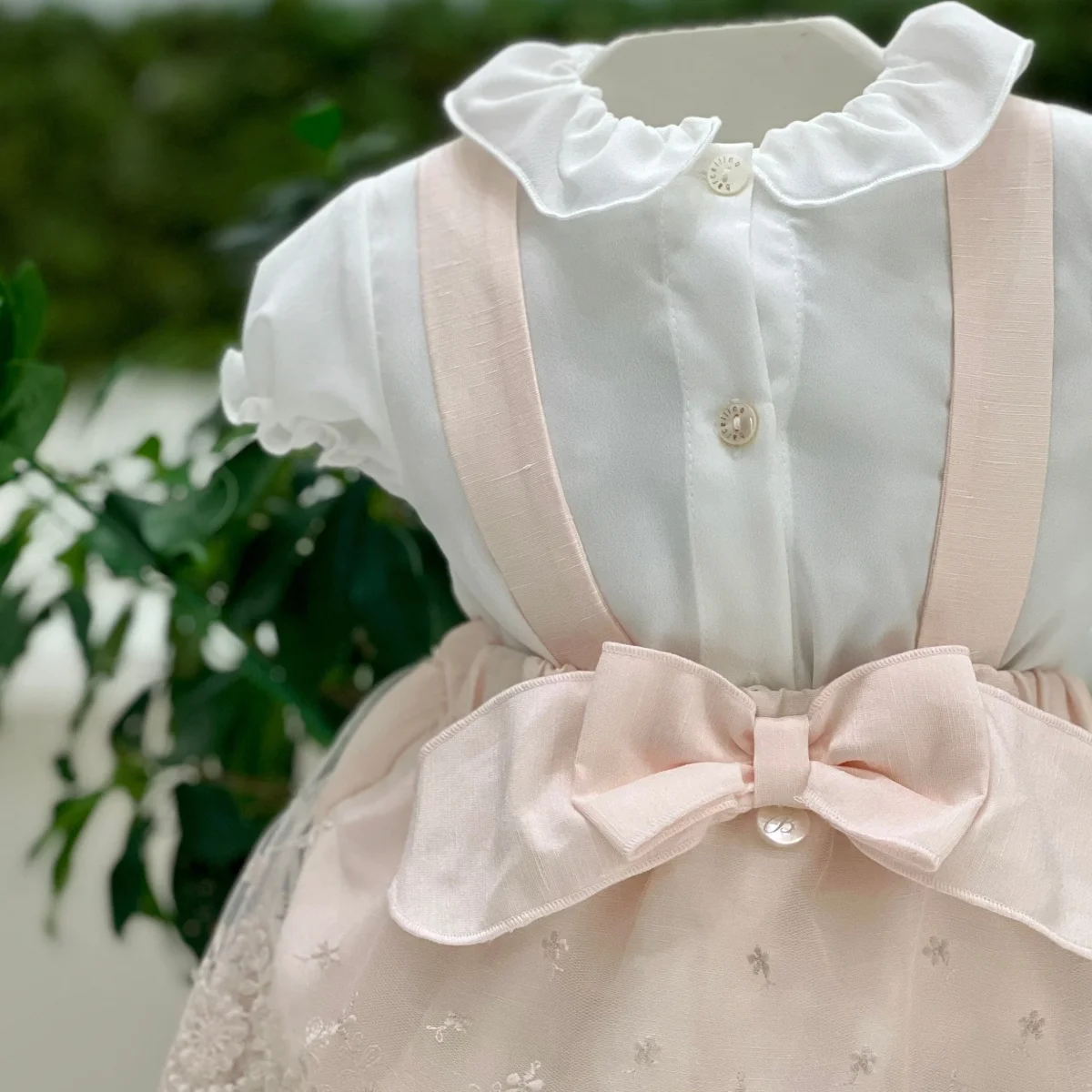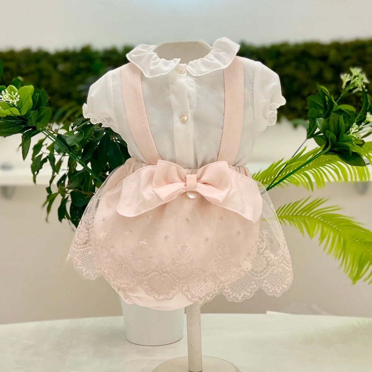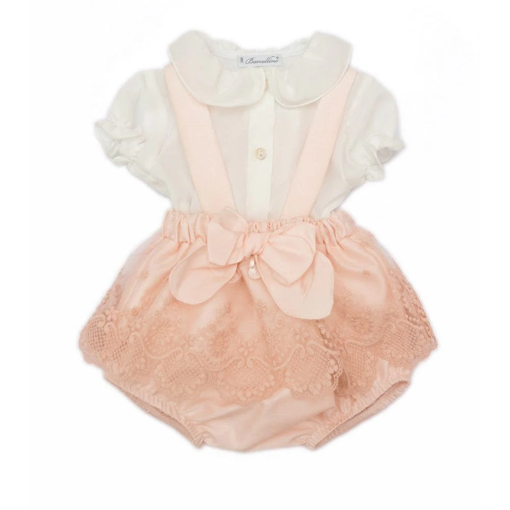 Elegante e raffinato completo due pezzi per neonata: camicina-body in georgette bianco latte con collo tondo e maniche leggermente a palloncino, che donano un tocco di femminilità. Apertura anteriore con bottoncini e chiusura a pressione fra le gambe. La culotte rosa con bretelle è arricchita da uno strato superiore in pizzo, che richiama lo stile romantico del capo, e un fiocco in tono applicato. La vita è regolata da una cintura elasticizzata per il massimo comfort. Un completo sofisticato e perfetto per le occasioni speciali!