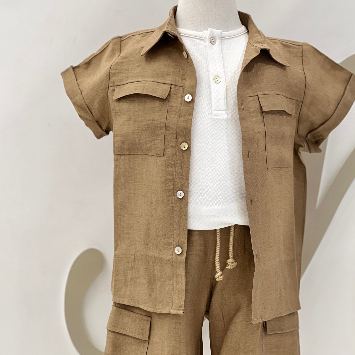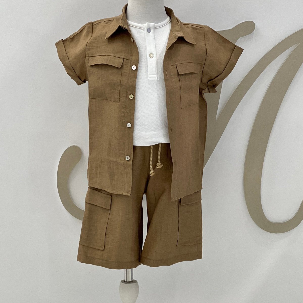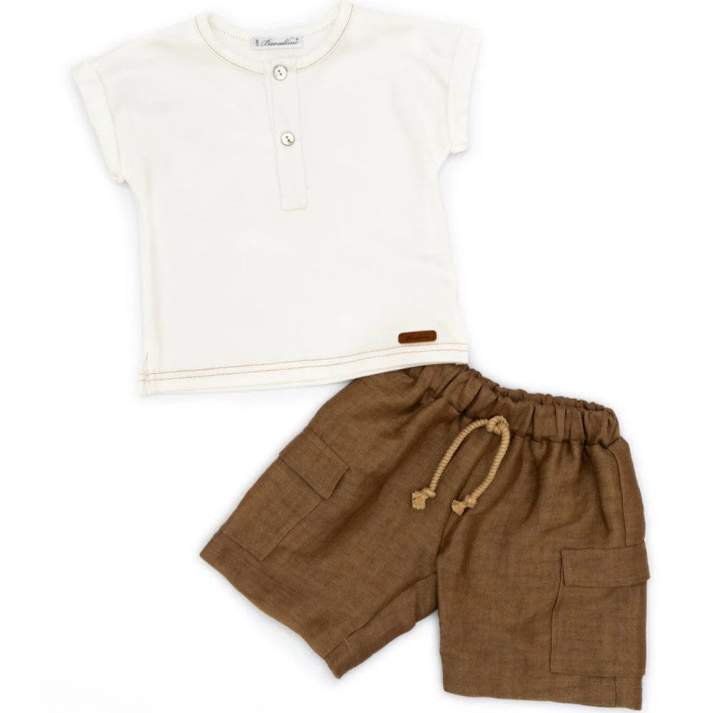 Completo tre pezzi per bambino: maglia in cotone bianco latte con scollo rotondo e bottoncini frontali, abbinata a pantaloncino marrone con maxi tasche e vita elasticizzata per il massimo comfort. Completa il look la camicia a manica corta con taschini e vestibilità oversize. Stile e praticità in un unico outfit.