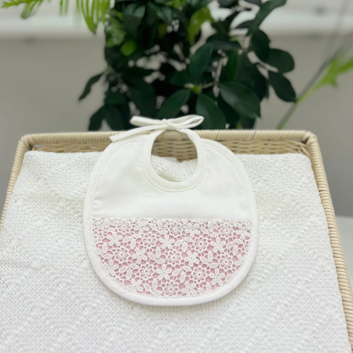 Bavetta in lino con dettaglio in macramé e fiore applicato. Un accessorio elegante e pratico, che unisce funzionalità e raffinatezza, perfetto per completare il look del neonato con un tocco di delicatezza e stile.