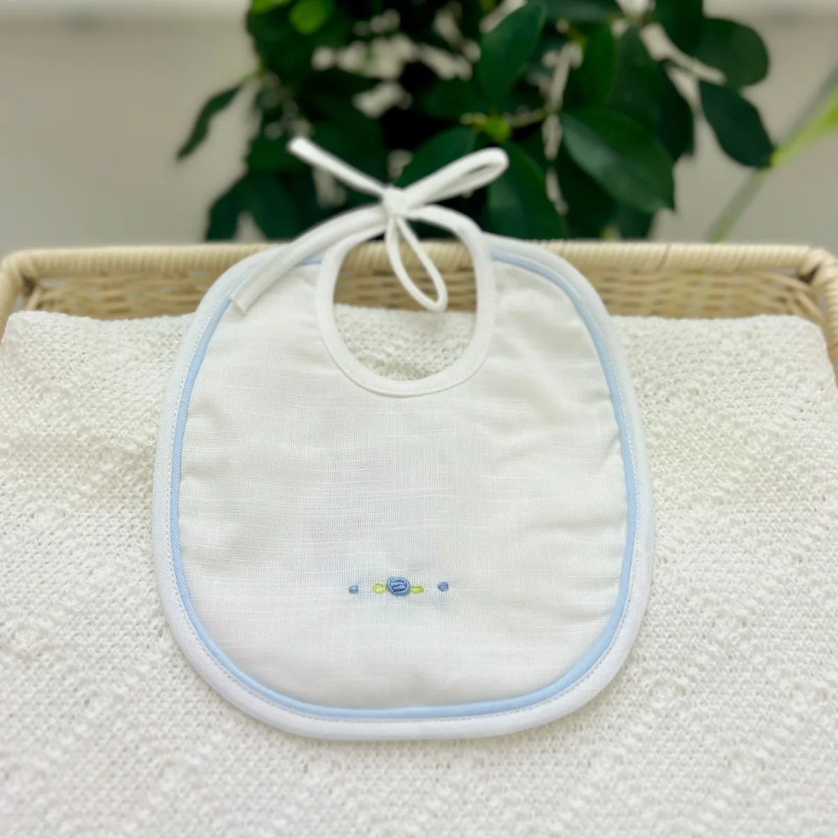 Bavetta in cotone con delicate roselline a vapore. Un accessorio morbido e elegante, perfetto per aggiungere un tocco di raffinatezza ai momenti quotidiani della tua piccola.