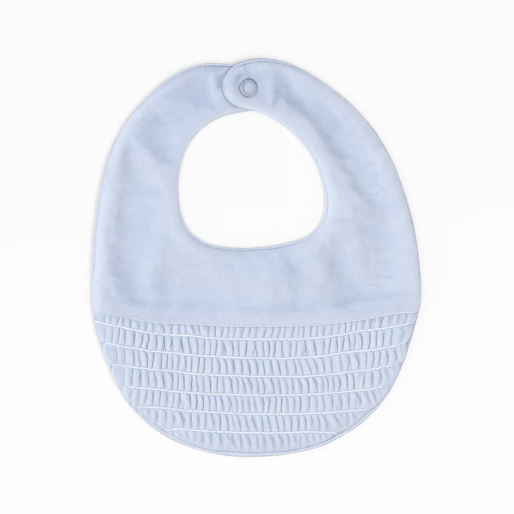 Bavetta in ciniglia con lavorazione smock sul davanti e chiusura sul retro con bottoncino a pressione.