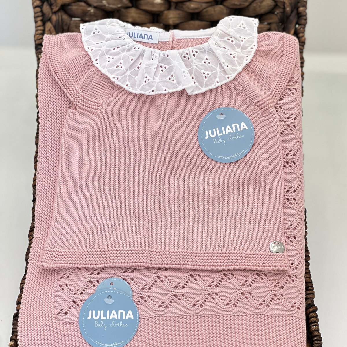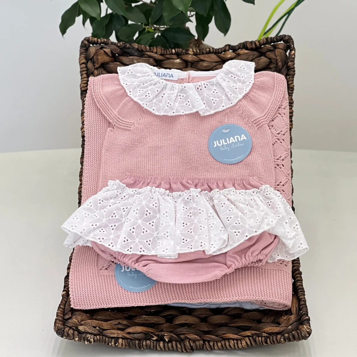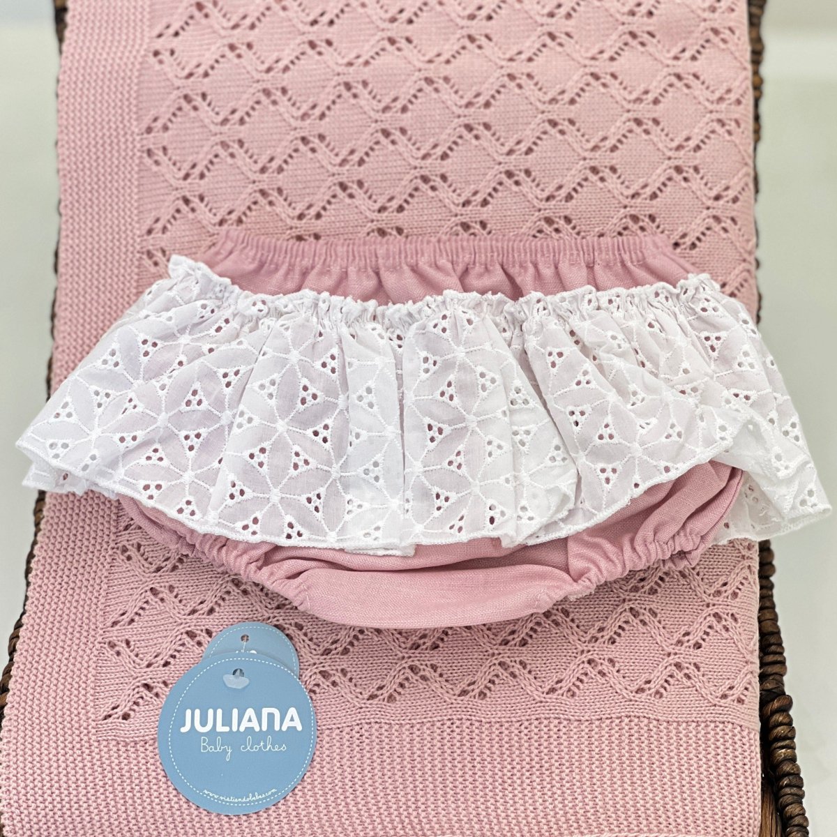 Completo per neonata composto da blusa in filo di cotone, manica ad aletta e colletto con rouches in sangallo, culotte in misto lino con rouches in sangallo.