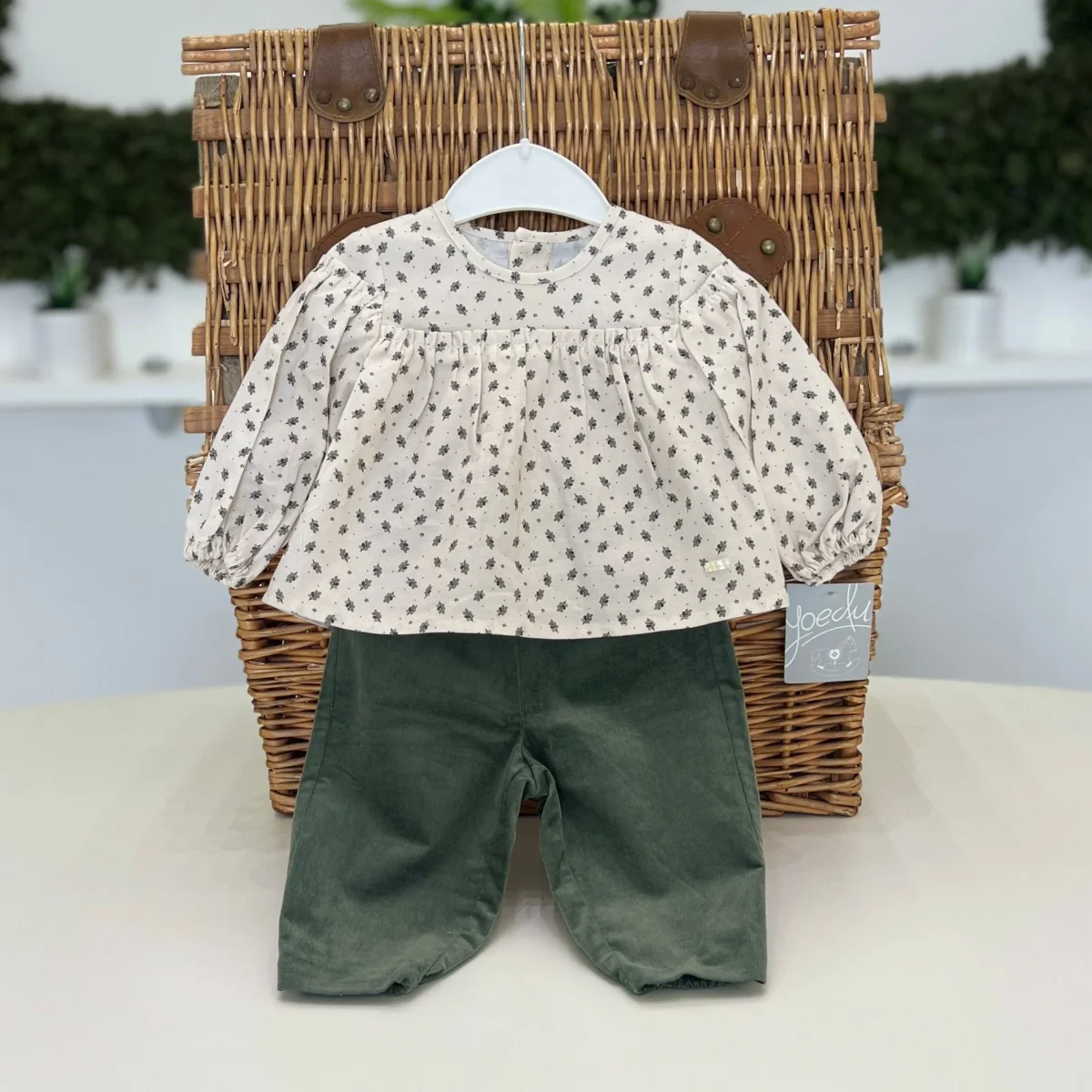 Completo due pezzi con blusa fantasia floreale e pantalone in caldo cotone rigato.