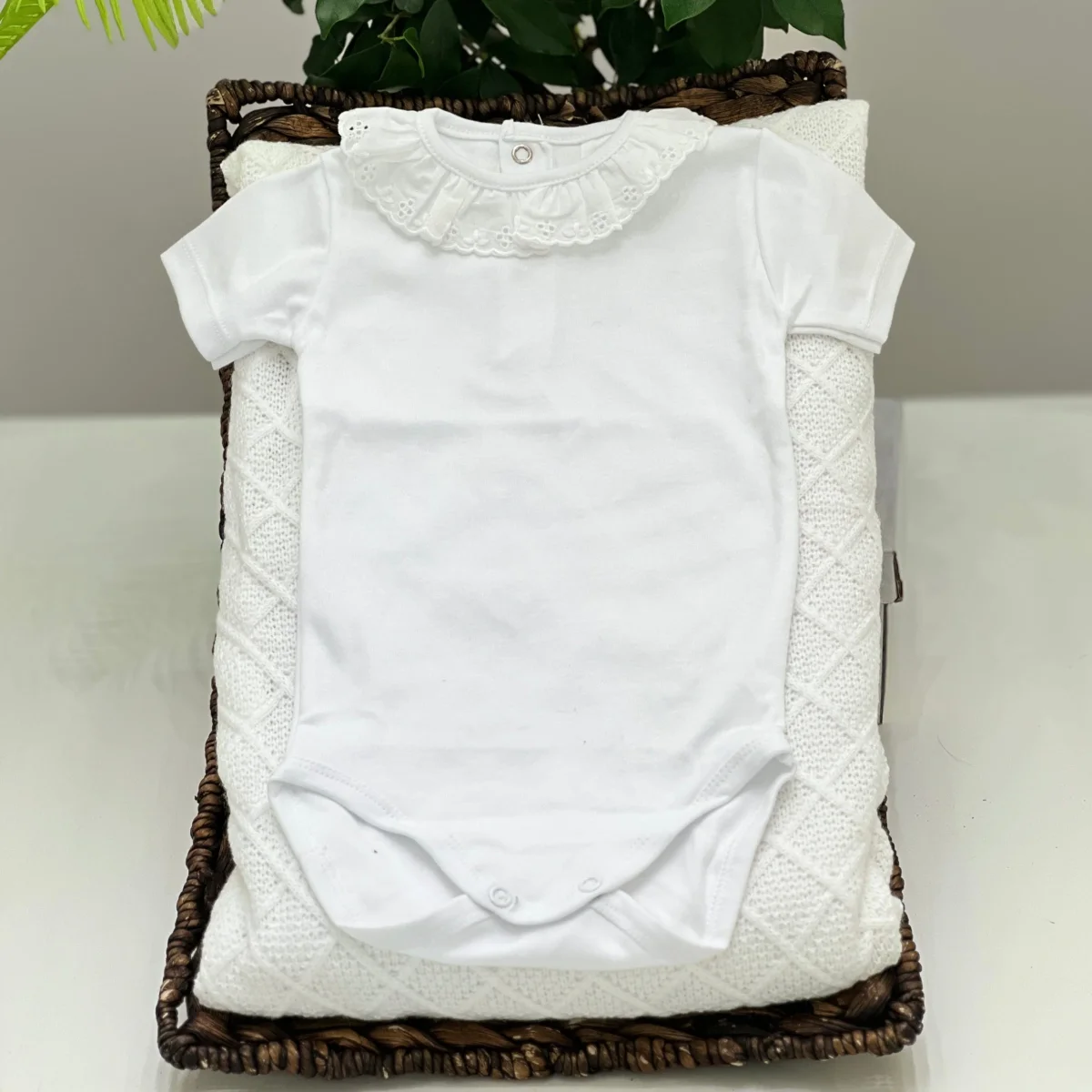 Body a manica corta in cotone con rouches sul collo in sangallo bianco. Elegante e fresco, perfetto per le giornate più calde, dona un tocco di dolcezza e raffinatezza al look del neonato. Ideale per occasioni speciali o per il quotidiano.