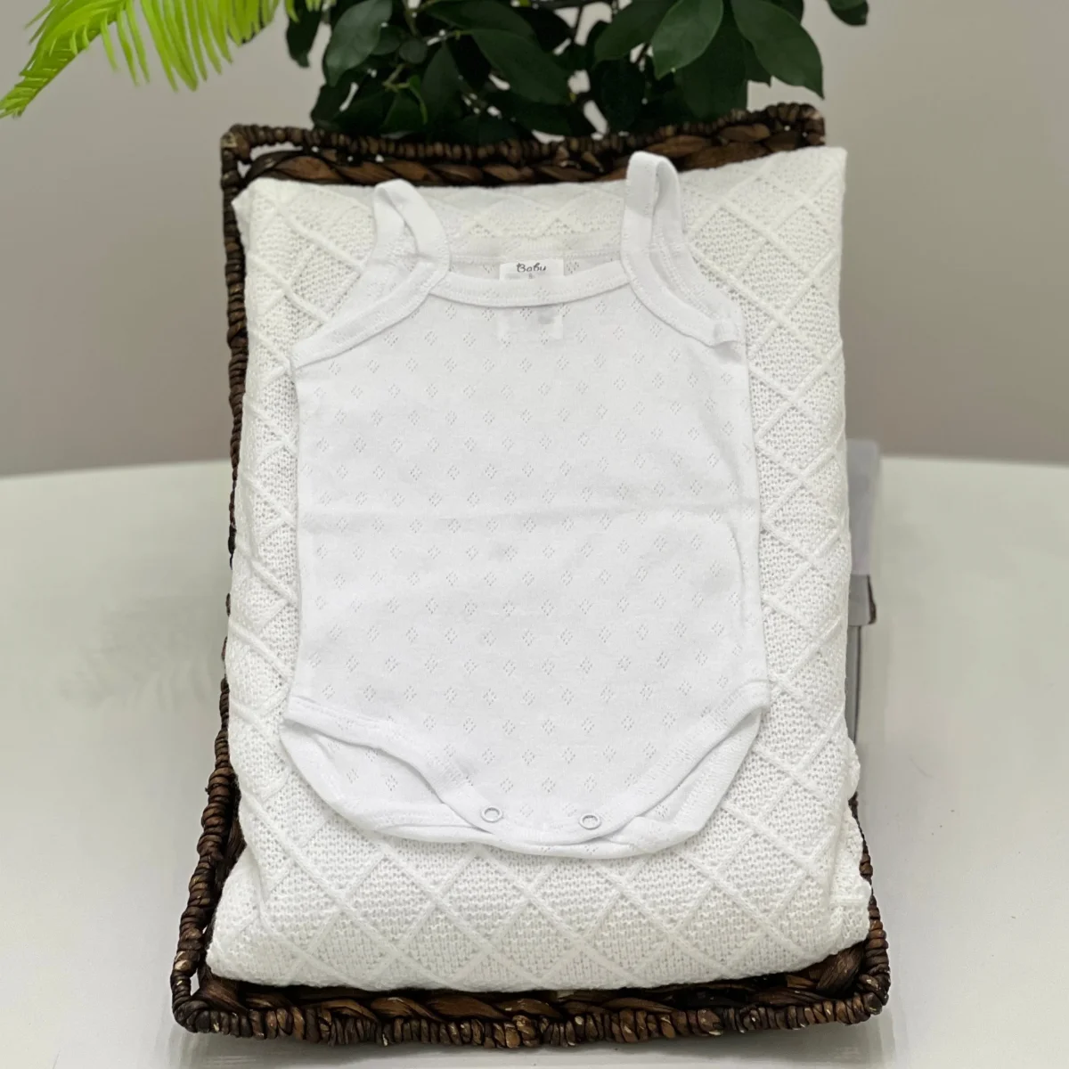 Body per neonata in filo di cotone traforato bianco, con spalline sottili. Un capo delicato e fresco, ideale per la stagione estiva, perfetto per ogni occasione speciale o per un look elegante e comodo.