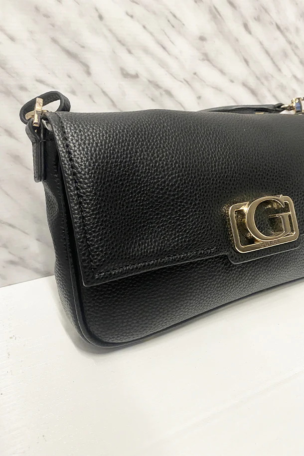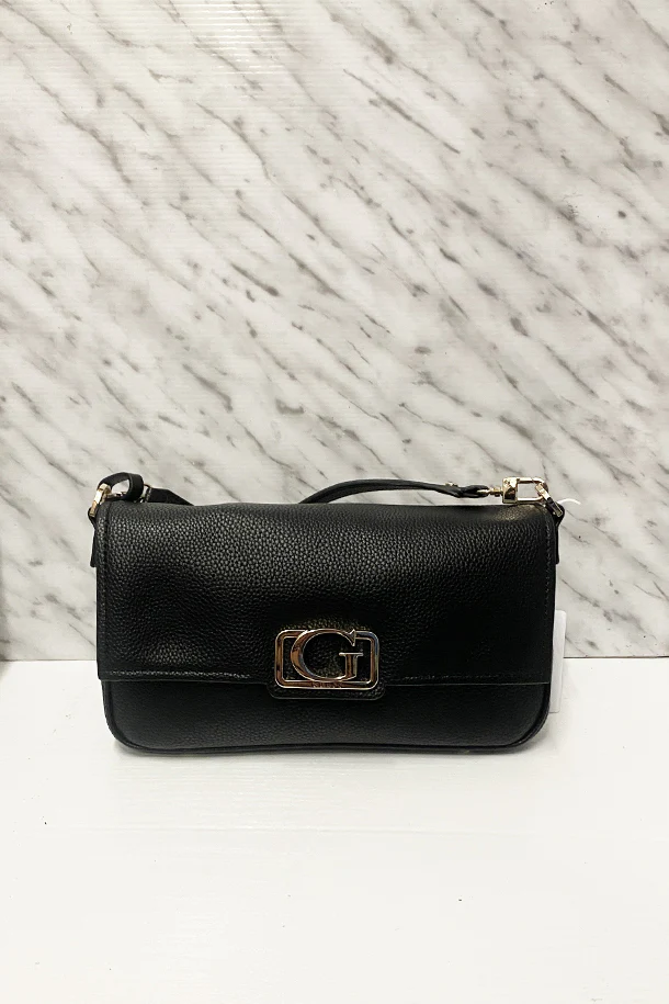 Borsa a mano in eco pelle solid color con manico in tinta, maxi logo metallico, tracolla regolabile e removibile, chiusura con clip magnetica, interno foderato con scomparti