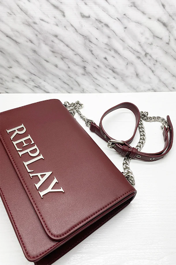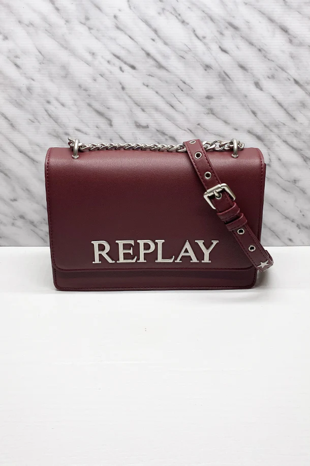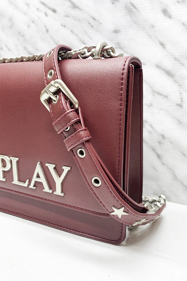 Borsa a spalla in eco pelle solid color con maxi logo metallico, tracolla borchiata regolabile, chiusura con patta magnetica, interno foderato con scomparti