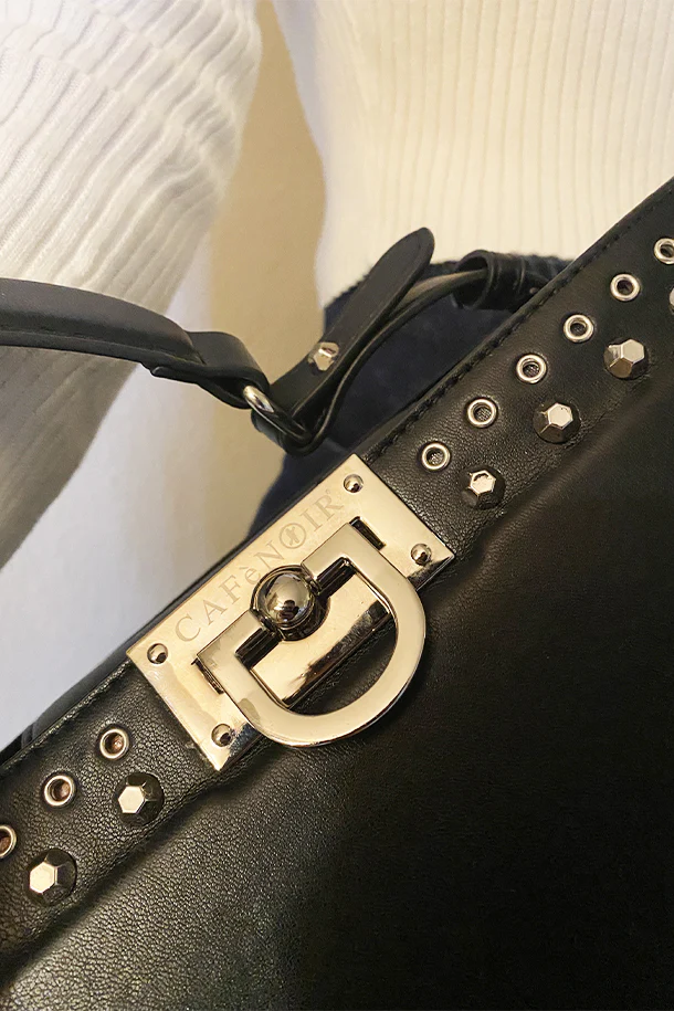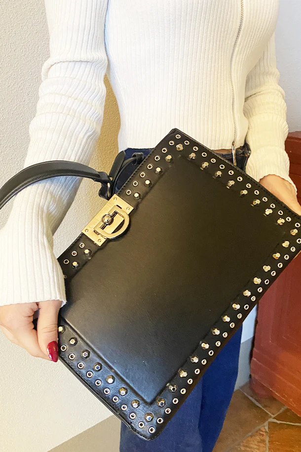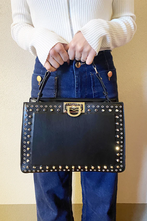 Borsa a mano in eco pelle solid color con borchie metalliche, manico morbido, tracolla removibile, chiusura con gancio, interno foderato con scomparti