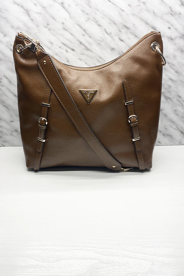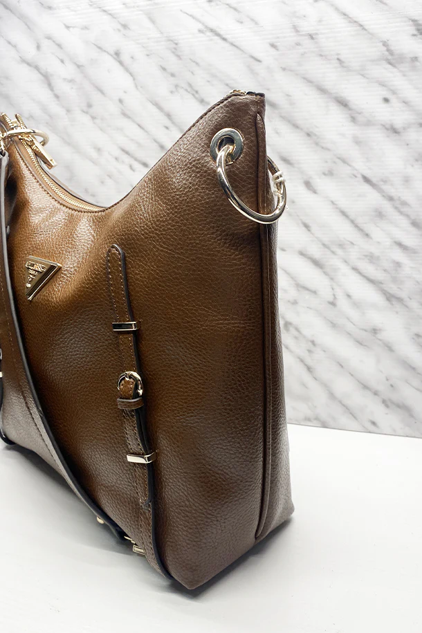 Borsa maxi in eco pelle martellata solid color, tracolla regolabile e removibile, badge con logo, lacci con fibbie decorativa, chiusura con zip, interno foderato con scomparti