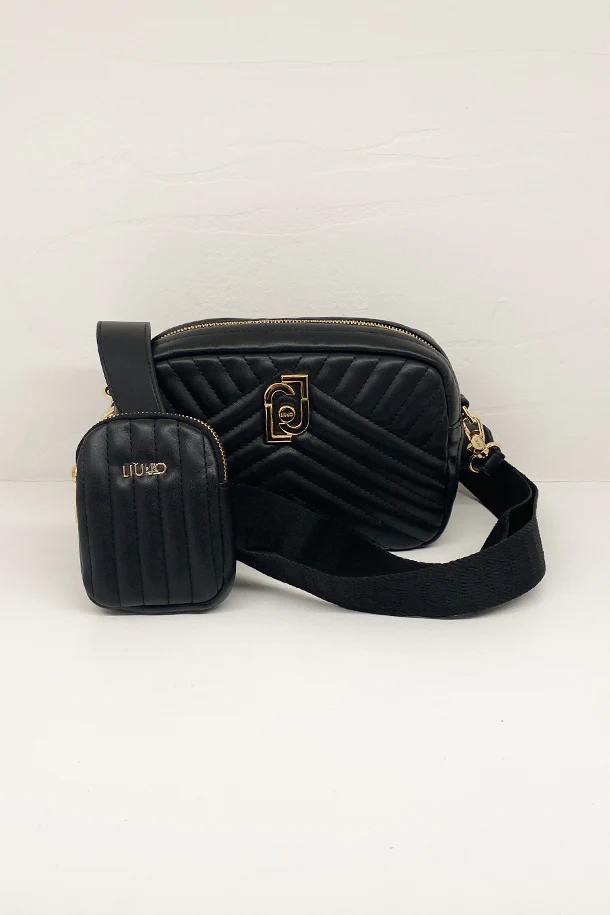 Borsa in eco pelle a cannelloni con tracolla regolabile removibile logata, chiusura con zip, logo metallico, pochette in tinta, interno foderato con scomparti