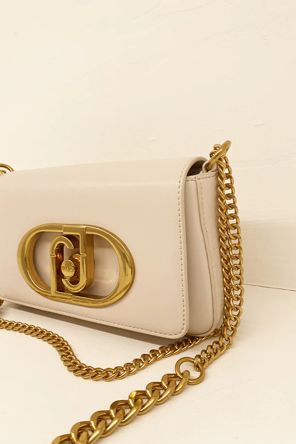 Borsa in eco pelle solid color con maxi logo metallico frontale, patta con chiusra magnetica, tracolla in catena metallica, interno foderato con scomparti