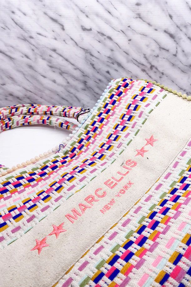 Borsa a mano semi rigida in tessuto ricamato con geometrie multi colore, logo impunturato, manici fantasia, chiusura con clip magnetica, interno sfoderato con tasca a zip
