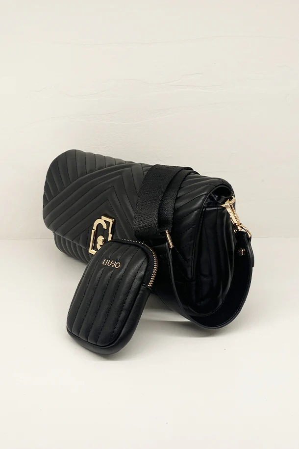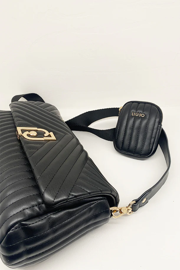 Borsa in eco pelle a cannelloni con tracolla regolabile removibile logata, chiusura con clip magnetica, logo metallico, pochette in tinta, interno foderato con scomparti