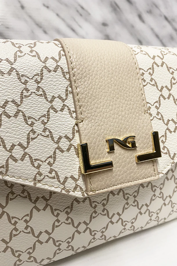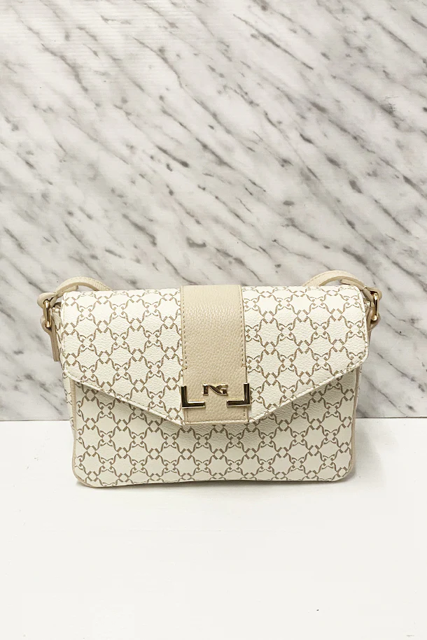 Borsa a spalla in pelle con stampa fantasia logata, dettagli a contrasto, tracolla regolabile e removibile, chiusura con clip e fascia logata, interno foderato con scomparti
