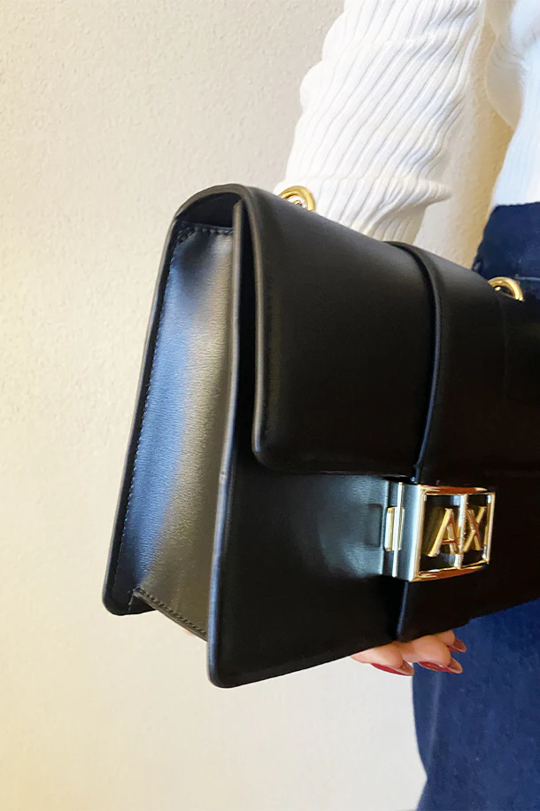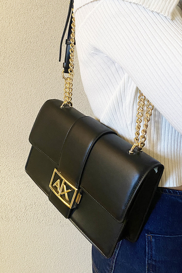 Borsa bauletto a mano in eco pelle solid color con borchie lucchetto e logo oro, chiusura con zip, tracolla removibile, interno foderato con scomparti