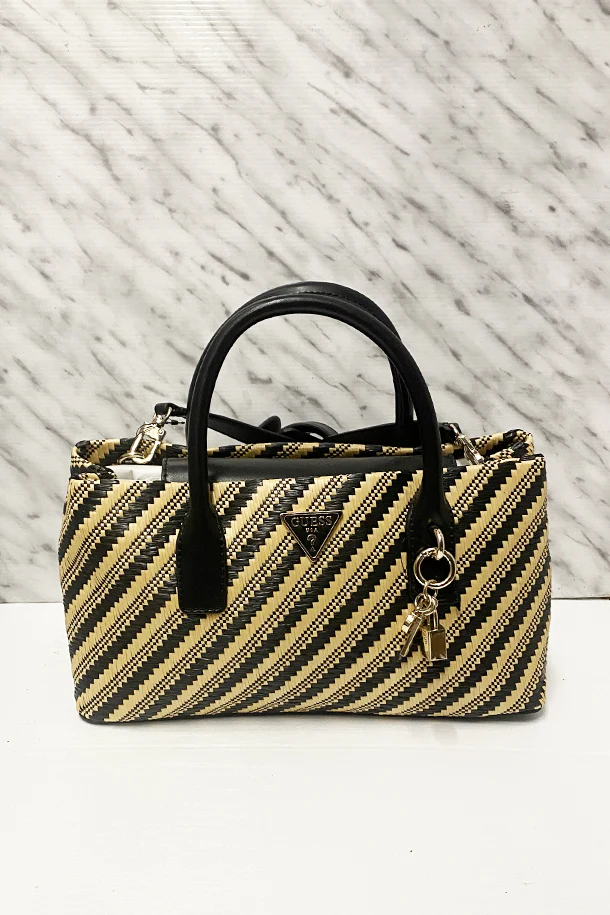 Borsa a mano in corda bicolore con dettagli e doppio manico rigido in eco pelle, logo metallico, tracolla regolabile e removibile, chiusura con zip, interno foderato con scomparti