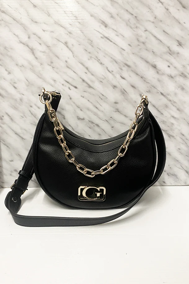Borsa a mano in eco pelle solid color con manico in catena metallica, maxi logo metallico, tracolla regolabile e removibile, chiusura con zip, interno foderato con scomparti
