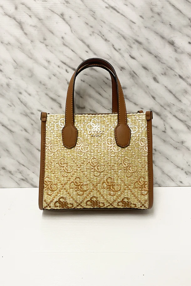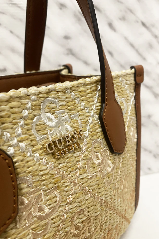 Borsa a mano in corda intrecciata naturale con doppio manico in eco pelle, finiture a contrasto, logo metallico frontale, tracolla regolabile removibile, interno foderato con scomparti