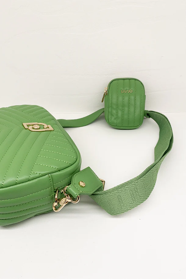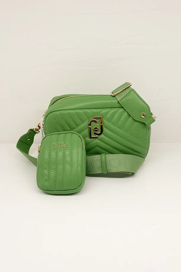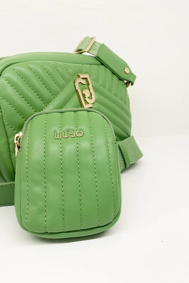 Borsa in eco pelle a cannelloni con tracolla regolabile removibile logata, chiusura con zip, logo metallico, pochette in tinta, interno foderato con scomparti