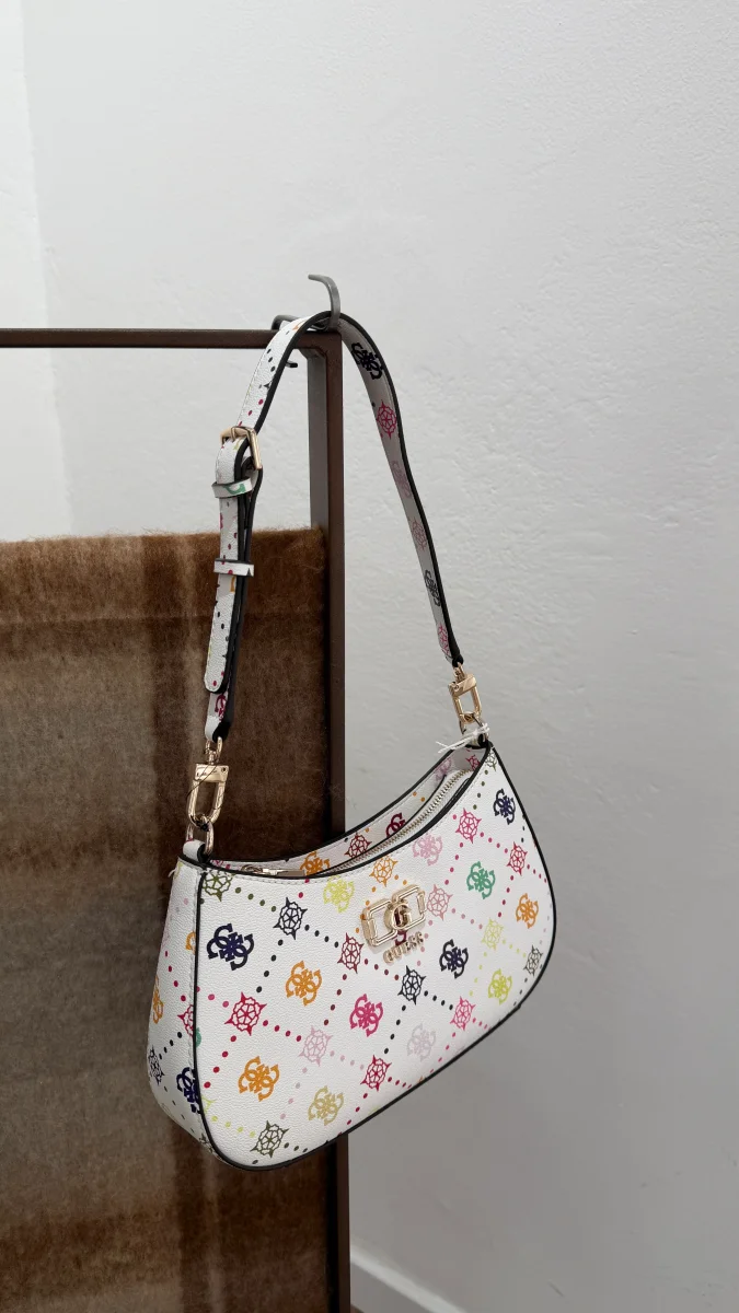 Borsa a spalla in eco pelle fantasia logata con tracolla regolabile e removibile, interno foderato con scomparti