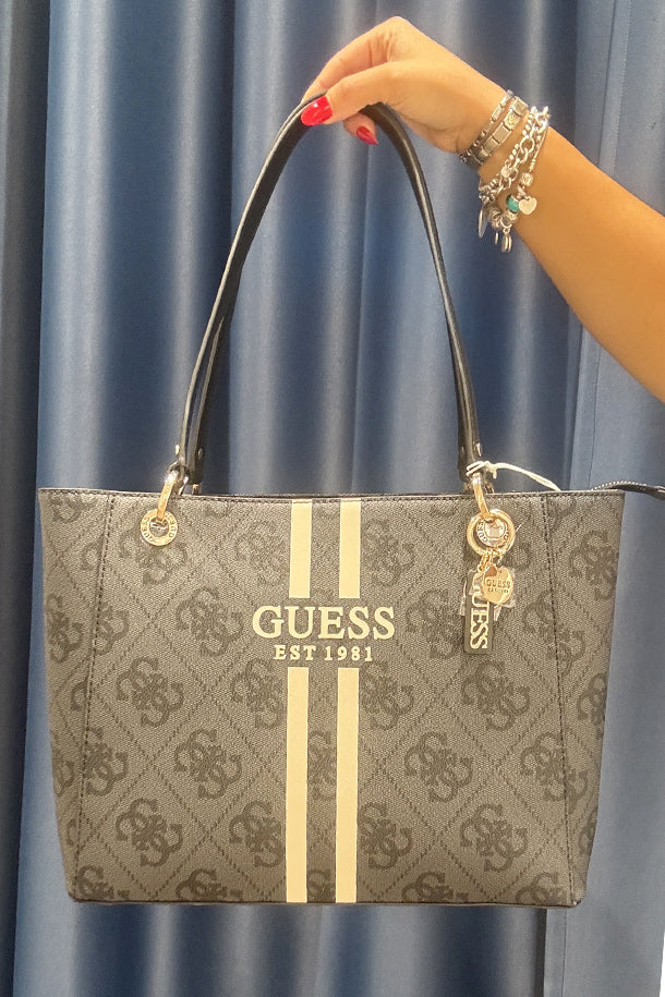 Borsa a spalla a in eco pelle stampa logata, doppi manici, tracolla removibile in tinta, maxi logo, portachiavi logato, chiusura con zip, interno foderato con scomparti