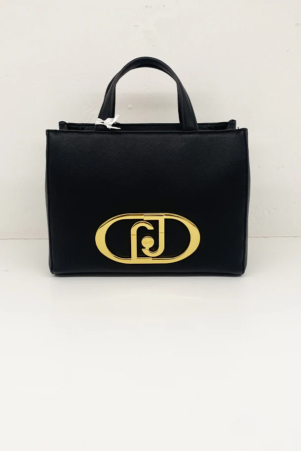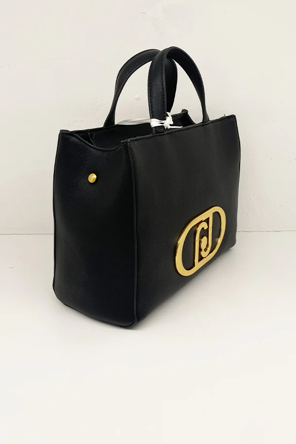 Borsa rigida a mano in eco pelle con manici in tinta, maxi logo frontale, tracolla removibile, chiusura con zip, interno foderato con scomparti